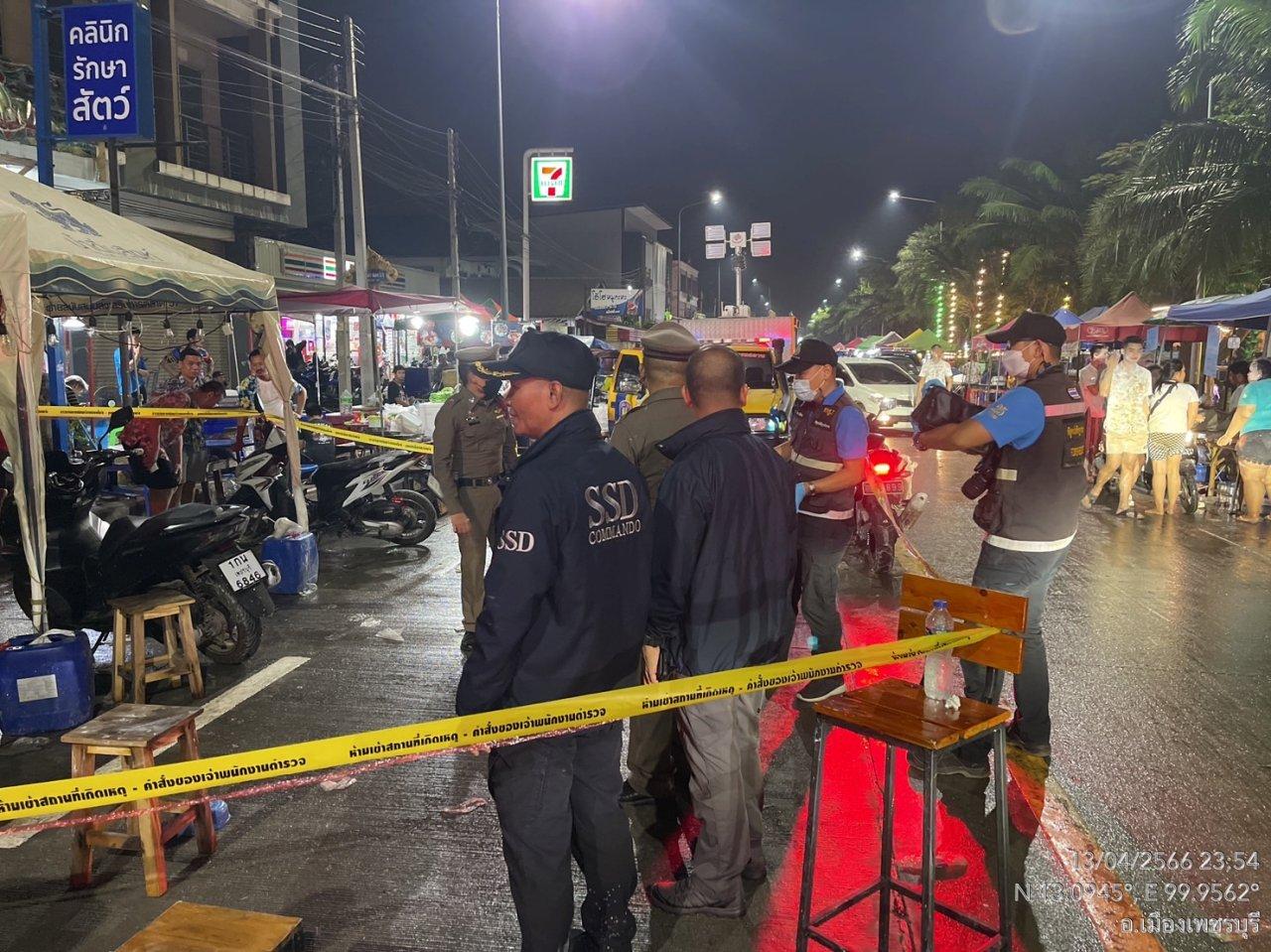 โดยเจ้าหน้าที่ตำรวจที่ปฏิบัติหน้าที่ป้องกันเหตุและรักษาความปลอดภัยช่วงเทศกาลสงกรานต์ บริเวณถนนภูมิรักษ์ (บุบผา) ต.ท่าราบ อ.เมือง จ.เพชรบุรี ได้แจ้งว่าได้มีเหตุใช้อาวุธปืนยิงจำนวนประมาณ 5-6 นัด มีผู้ได้บาดเจ็บในที่เกิดเหตุ (ไม่สาหัส) จำนวน 5 คน เจ้าหน้าที่ได้นำตัวส่งโรงพยาบาล พ.ต.อ.วันชัย ขาวรัมย์ ผกก.สภ.เมืองเพชรบุรี ได้ไปยังที่เกิดเหตุ สั่งการให้เจ้าหน้าที่ตำรวจร่วมกันติดตามจับกุมผู้ก่อเหตุ และสั่งการให้ พ.ต.ท.สิทธิพร ฉ่ำมะนา รอง ผกก.สส.สภ.เมืองเพชรบุรี และชุดสืบสวน ได้สืบสวนติดตามผู้ก่อเหตุ ซึ่งทราบชื่อจำนวน 2 คน และให้รวบรวมพยานหลักฐานให้ พงส.ดำเนินการขอออกหมายจับ