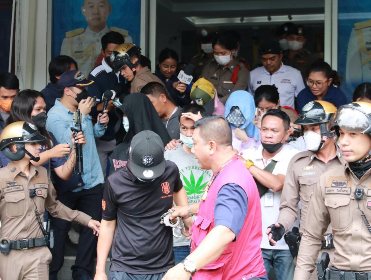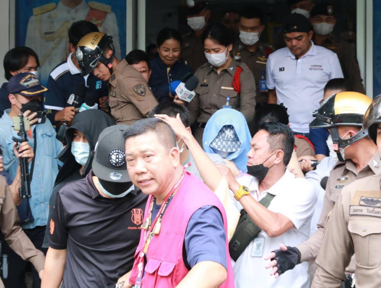 ล่าสุด เมื่อเวลา 13.11 น. วันที่ 19 เมษายน 2566 ที่ สน.ลุมพินี พนักงานสอบสวนนำตัวผู้ต้องหาทั้ง 5 ราย ประกอบด้วย นายณัฐพงษ์ ฆ้องคำ หรือจูน อายุ 24 ปี (สวมเสื้อยืดสีเทาลายกัญชา) และนายศุภผล ฮาลมัน หรือกาย อายุ 24 ปี (สวมเสื้อยืดสีดำใช้เสื้อดำคลุมหัว) น.ส.เพชรลดา แสงสกุล หรือน้ำเพชร อายุ 24 ปี (สวมชุดนอนสีชมพูลายสีขาว-หมวกแก๊ปสีดำ), น.ส.สริตา ดอนม่วง อายุ 28 ปี (สวมเสื้อยืดสีดำ, หมวกสีดำ-เหลือง) และ นายธนายุทธ พลนาคู หรือโจ อายุ 30 ปี (สวมเสื้อยืดสีดำ) ซึ่งทั้งหมดเป็นผู้ต้องหาตามหมายจับศาลอาญากรุงเทพใต้ ที่ 304-302-307-305-306 ลงวันที่ 17-18 เม.ย .66 ข้อหาร่วมกันเรียกค่าไถ่โดยขู่เข็ญ ใช้กำลังประทุษร้ายฯ, ร่วมกันกรรโชกทรัพย์, ร่วมกันหน่วงเหนี่ยวหรือกักขังผู้อื่น และความผิดตาม พ.ร.บ.คอมพิวเตอร์ เพื่อส่งฝากขังยังศาลอาญากรุงเทพใต้ โดยค้านประกันชั้นพนักงานสอบสวน