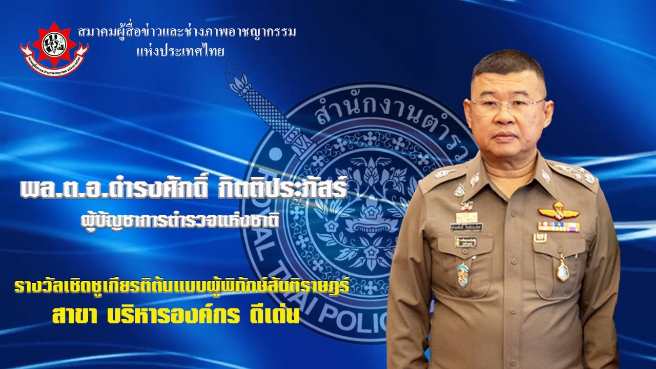 พล.ต.อ.ดำรงศักดิ์ กิตติประภัสร์ ผบ.ตร. รางวัลเชิดชูเกียรติต้นแบบผู้พิทักษ์สันติราษฎร์ “สาขาบริหารพัฒนาองค์กรดีเด่น” โดยหลังจากที่ก้าวเข้ามาคุมบังเหียนผู้นำสูงสุดของตำรวจ ท่ามกลางวิกฤติศรัทธาและความหวังของประชาชนที่อยากเห็นตำรวจทำหน้าที่ให้สมกับการเป็นผู้พิทักษ์สันติราษฎร์ ตลอดระยะเวลาที่ “บิ๊กเด่น” สวมบทผู้นำองค์กรได้เจอมรสุมเรื่อยมา และบ่อยครั้งที่เกิดเรื่องอื้อฉาวในแวดวงสีกากี แต่ด้วยความเป็นผู้นำที่กล้าตัดสินใจ ได้นำพาองค์กรตำรวจฝ่าฟันอุปสรรคกอบกู้ภาพลักษณ์และความศรัทธาขององค์กรตำรวจ และยังเน้นย้ำในเรื่องการให้ความสำคัญกับการพัฒนาองศ์กร การปราบปรามอาชญากรรม และการฝึกอบรมบุคลากร บำบัดทุกข์บำรุงสุขให้กับประชาชนด้วยดีตลอดมา
