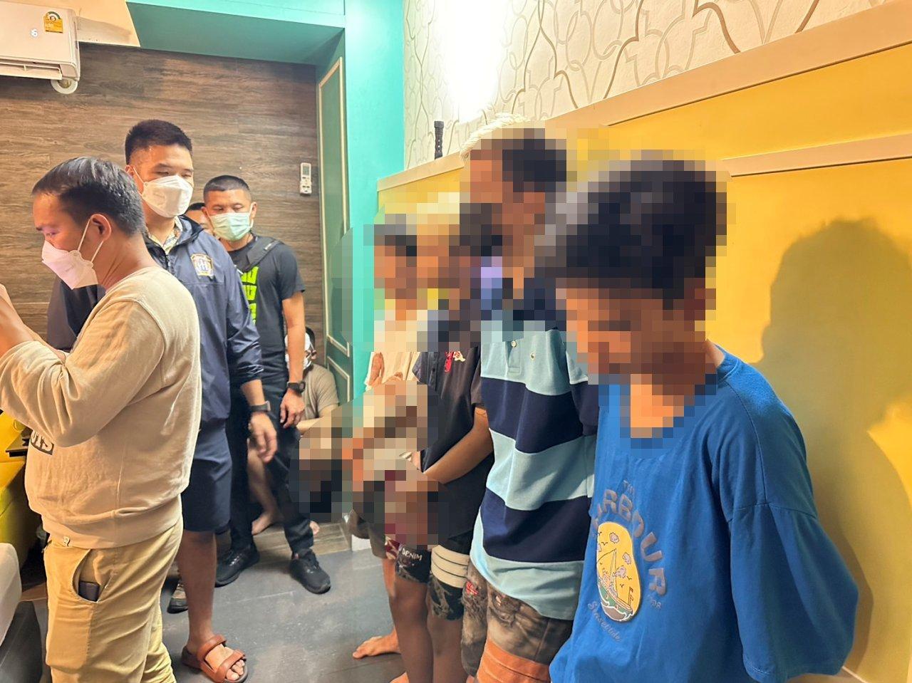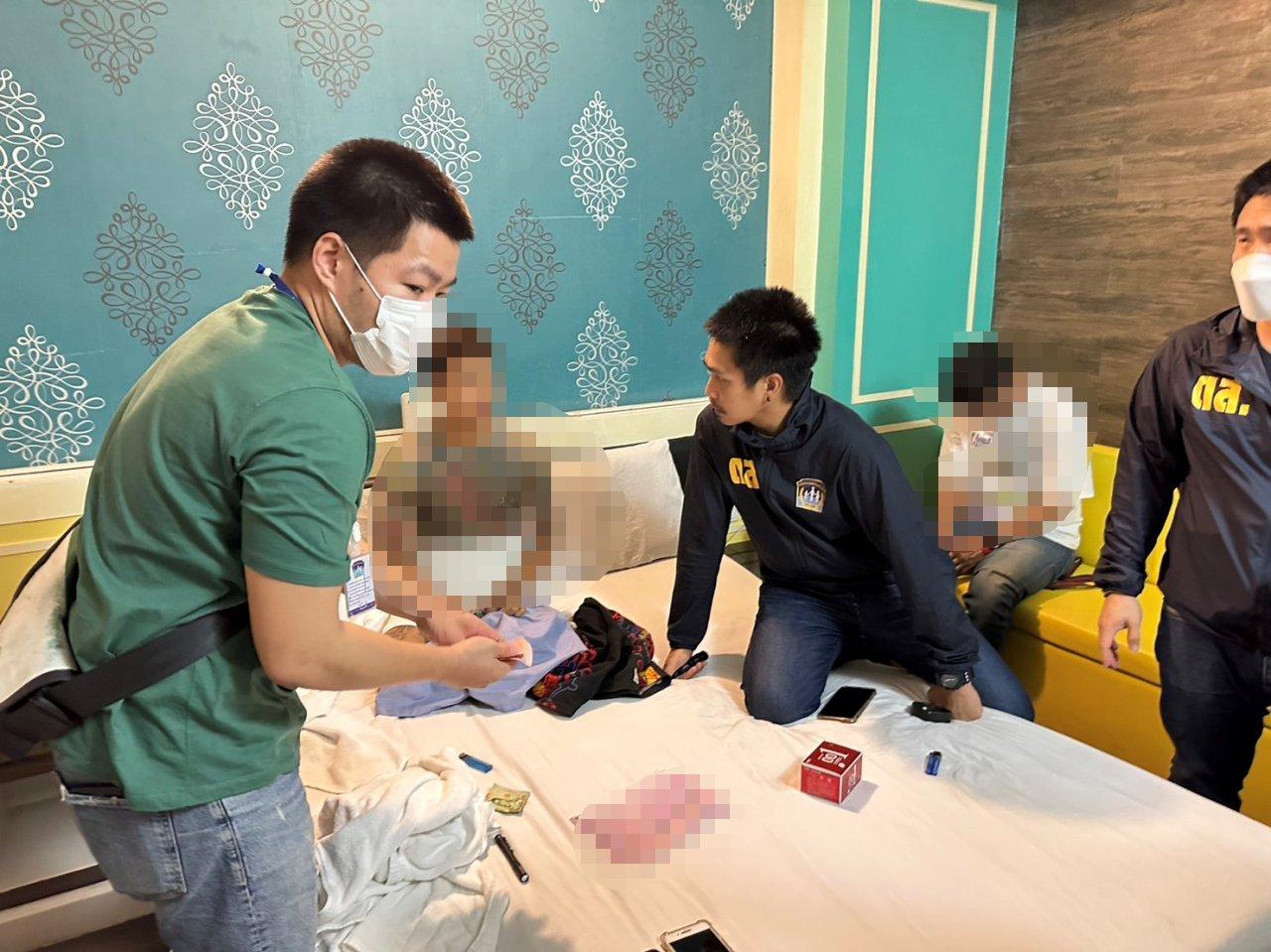 เมื่อถึงเวลานัดหมาย สายลับได้เดินทางไปพบกับผู้ต้องหาที่โรงแรมดังกล่าวตามที่ได้ตกลงกันไว้ โดยมีเจ้าหน้าที่ตำรวจคอยซุ่มดูอยู่บริเวณใกล้เคียง ก่อนพบว่ามีผู้ต้องหาและผู้ให้บริการอีกจํานวน 4 ราย อายุตั้งแต่ 14-19 ปี โดยให้บริการในลักษณะสวิงกิ้ง หรือเซ็กซ์หมู่ เจ้าหน้าที่จึงแสดงตัว ก่อนควบคุมตัวทั้งหมดมาสอบสวน