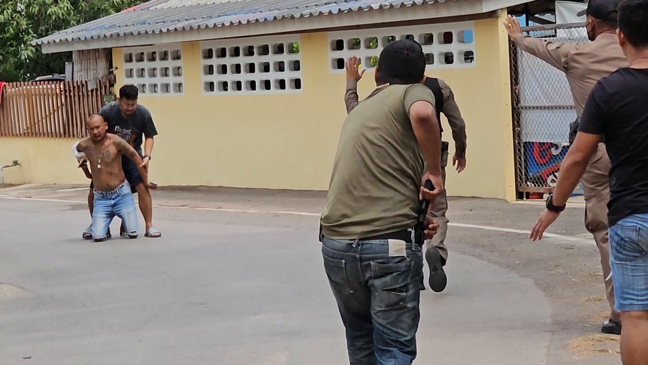 พบเป็นบ้านปูนชั้นเดียว และมีเสียงปืนดังออกมา 3 ชุด กว่า 20 นัด เจ้าหน้าที่จึงถอยห่างออกมาประมาณ 100 เมตร โดยผู้ก่อเหตุมีอาการคลุ้มคลั่ง ยังถือปืนเดินอยู่ในบ้าน ต่อมาได้ติดต่อให้ญาติเจรจาจนผู้ก่อเหตุยอมมอบตัว ทราบชื่อผู้ก่อเหตุคือ นายไพโรจน์ จินตพงศ์ หรือ ติ๊ก อายุ 36 ปี ภูมิลำเนาอยู่ ต.บางจะเกร็ง เป็นลูกเขยของบ้าน ถือปืนพกสั้นกึ่งอัตโนมัติขนาด 9 มม. ซึ่งเป็นอาวุธที่ใช้ก่อเหตุ เจ้าหน้าที่จึงควบคุมตัวไว้ได้