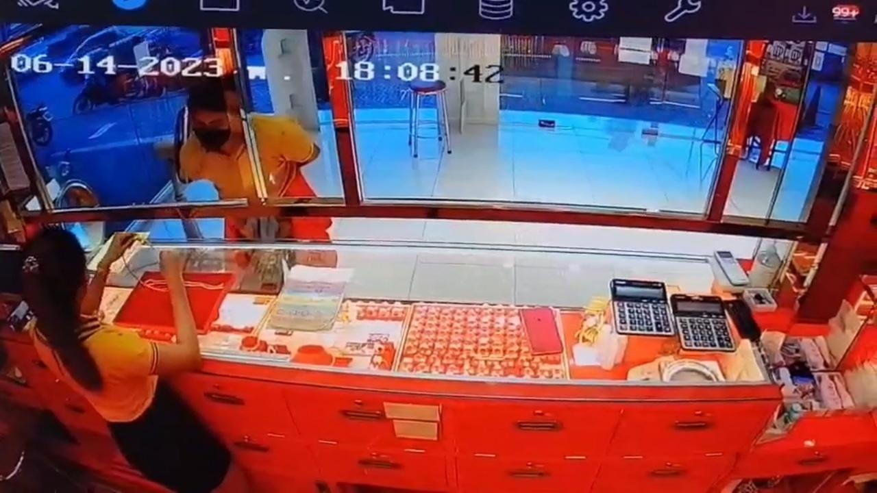 จากการสอบถามนางสาวณิชกมล ไชยสงค์ อายุ 20 ปี พนักงานร้านทอง บอกว่าคนร้ายเข้ามาปกติเลยโดยขอดูสร้อยคอผู้หญิง 2 บาท ผู้ชาย 3 บาท ตนก็เลยหยิบให้ดู คนร้ายบอกว่าขอสร้อยคอผู้หญิงที่มีจี้ ตนก็หยิบให้ดู ถามว่าใช่ลายนี้ไหม คนร้าย บอกว่าลายเต็นท์ เพราะลายเต็นท์แข็งแรง ทีนี้คนร้ายทำเป็นหยิบโทรศัพท์โดยบอกขอดูว่ามีลายทองตามรูปไหม ตนเลยบอกว่า ของถาดตนมีแค่นี้เอง แล้วคนร้ายบอกอีกว่า ขอพี่ดูก่อนนะ ตนก็หยิบลงมา 3 เส้นของผู้ชาย 3 บาท 2 เส้น และ 2 บาท 1 เส้น
