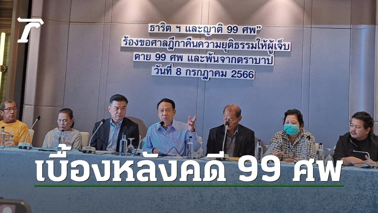 ความคืบหน้าที่โรงแรมมิราเคิลแกรนด์ หลักสี่ เมื่อเวลา 11.00 น. วันที่ 8 กรกฎาคม 2566 นายธาริต เพ็งดิษฐ์ อดีตอธิบดีดีเอสไอ ทนายความ พร้อมญาติผู้เสียชีวิตในคดี 99 ศพ อาทิ นางพะเยาว์ อัคฮาด แม่ของกมนเกด อัคฮาด พยาบาลอาสาที่เสียชีวิตที่วัดปทุมฯ นายบรรเจิด ฟุ้งกลิ่นจันทร์ พ่อของนายเทิดศักดิ์ ฟุ้งกลิ่นจันทร์ เสียชีวิตบริเวณแยกคอกวัว เป็นต้น แถลงเปิดเผยข้อมูลคดีดังกล่าวที่ไม่เคยเปิดเผยที่ไหนมาก่อน "ธาริตฯ และญาติ 99 ศพ" ร้องขอศาลฎีกาคืนความยุติธรรมให้ผู้ตาย 99 ศพและพ้นจากตราบาป