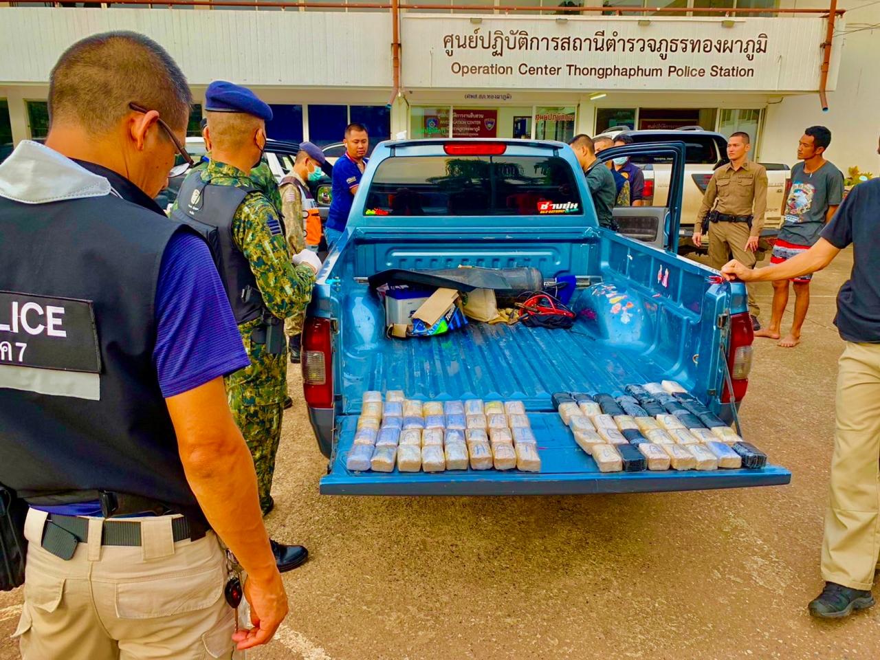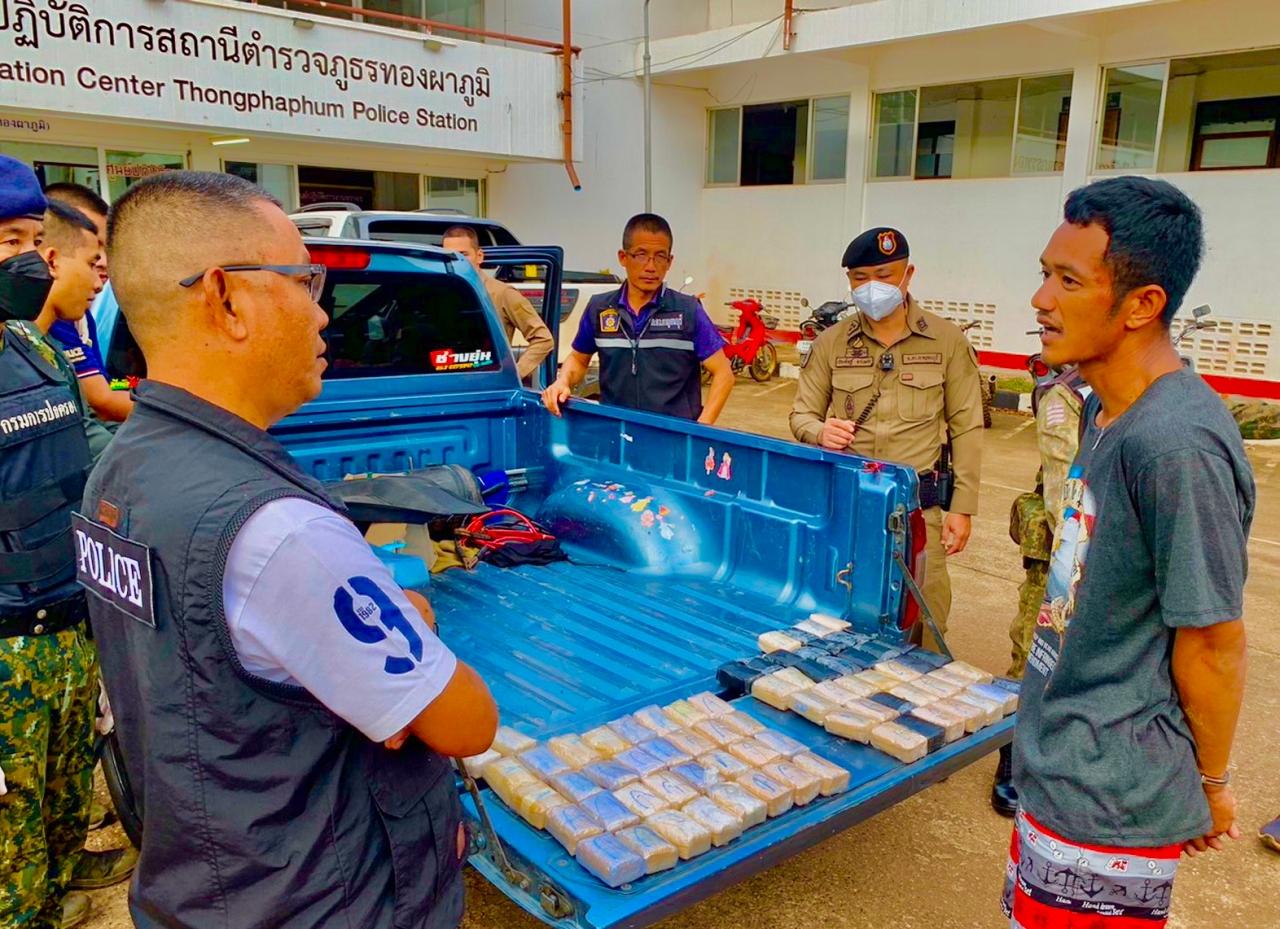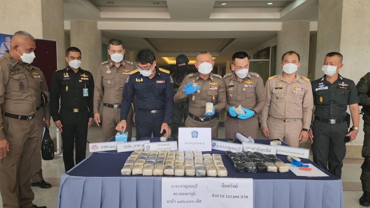 เมื่อเวลา 13.00 น. ของวันที่ 11 กรกฎาคม 2566 พล.ต.ท.ธนายุตม์ วุฒิจรัสธำรงค์ ผบช.ภ.7 พร้อมด้วยนายตำรวจที่เกี่ยวข้อง พ.ต.อ.มนตรี แตงโต ผกก.สภ.ทองผาภูมิ เจ้าหน้าที่ชุดสืบสวน กก.สส.3 บก.สส.ภ.7 เจ้าหน้าที่ชุดสืบสวน กก.สส.ภ.จว.กาญจนบุรี เจ้าหน้าที่ตำรวจ ร้อย ตชด.135 ร่วมกันแถลงผลการจับกุมกลุ่มขบวนการลักลอบลำเลียงยาเสพติดรายสำคัญในพื้นที่ภาค 7