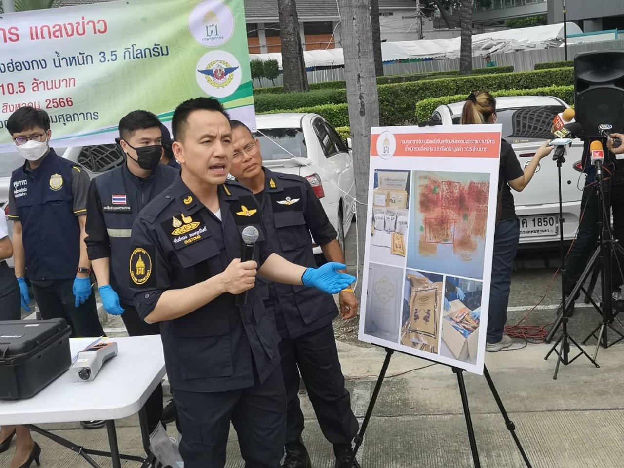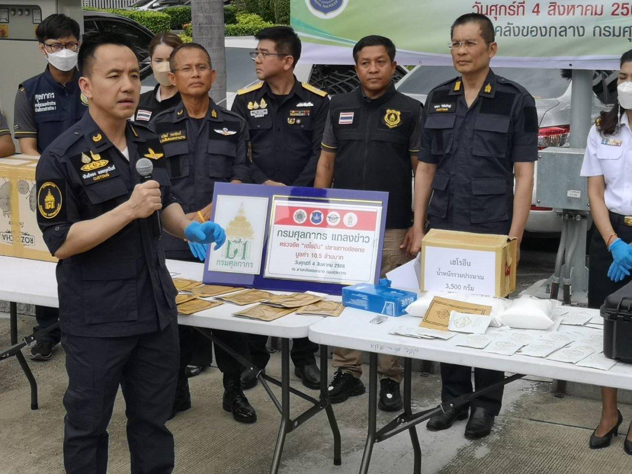 นายพันธ์ทอง กล่าวว่า เมื่อวันที่ 3 ส.ค. เจ้าหน้าที่กรมศุลกากร เจ้าหน้าที่สำนักงานคณะกรรมการป้องกันและปราบปรามยาเสพติด (ป.ป.ส.) ร่วมกันตรวจสอบกล่องพัสดุด่วนระหว่างประเทศ ส่งมาจากบริษัทขนส่งเอกชนเขตบางกะปิ ไปยังเขตบริหารพิเศษฮ่องกง สาธารณรัฐประชาชนจีน โดยสำแดงสินค้าเป็นแผ่นประคบร้อน จำนวน 12 ถุง มีร่องรอยปิดผนึกใหม่ด้วยความร้อน เมื่อเปิดดูภายในมีซองย่อยอีก 4 ซอง รวม 48 ซอง ภายในพบยาเสพติดประเภท 1 เฮโรอีน น้ำหนักรวมสิ่งห่อหุ้ม 3.5 กิโลกรัม มูลค่า 10.5 ล้านบาท