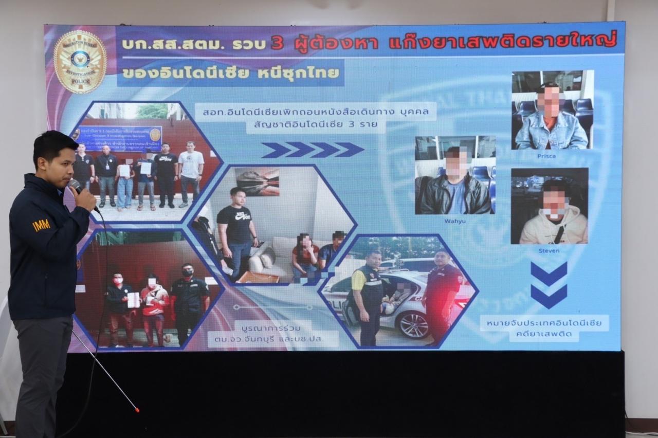 คดีที่สอง บก.สส.สตม. รวบ 3 ผู้ต้องหา แก๊งยาเสพติดรายใหญ่ของอินโดนีเซีย หนีซุกไทย พร้อมได้เพิกถอนหนังสือเดินทางอินโดนีเซีย จำนวน 3 ราย คือ 1. นายสตีเว่น อายุ 28 ปี 2. นายวายู อายุ 30 ปี 3. นางพิสก้า อายุ 26 ปี เป็นบุคคลตามหมายจับรัฐบาลอินโดนีเซียกระทำความผิดเกี่ยวกับยาเสพติด และพากันหลบหนีมาอยู่ในประเทศไทย ด้วยวีซ่านักท่องเที่ยวและการอนุญาตให้อยู่ในราชอาณาจักรยังไม่สิ้นสุด ผบก.สส.สตม. จึงได้อนุมัติให้เพิกถอนการอนุญาตให้อยู่ในราชอาณาจักร เนื่องจากพิจารณาเห็นว่าเป็นบุคคลซึ่งเจ้าหน้าที่รัฐบาลต่างประเทศได้ออกหมายจับ ต่อมาชุดสืบสวนสืบทราบว่า นายวายูและนางพิสก้า หลบหนีมาอาศัยอยู่บริเวณคอนโดฯ พื้นที่บางกะปิ กทม. จึงได้ร่วมกันเข้าตรวจสอบ และนำตัวส่ง กก.3 บก.สส.สตม. เพื่อดำเนินการต่อไป ต่อมาขณะเจ้าหน้าที่ชุดสืบสวนติดตามบุคคลที่เหลือนั้น ได้รับแจ้งจาก ตม.จว.จันทบุรี ว่าได้มีบุคคลต่างด้าวชื่อ นายสตีเว่น สัญชาติ อินโดนีเซีย กำลังจะเดินทางออกนอกประเทศ จึงได้ร่วมกันนำตัว นายสตีเว่น ส่ง กก.3 บก.สส.สตม. เพื่อดำเนินการต่อไป