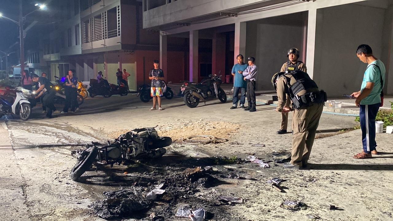 เมื่อเวลา 01.30 น. วันที่ 3 ก.ย. 66 พ.ต.ท.ณธกร จันทร์ลอด สวป. สภ.หนองปรือ รับแจ้งเหตุรถ จยย.ถูกไฟไหม้ มีคนถูกไฟคลอกได้รับบาดเจ็บ เหตุเกิดบริเวณหน้าคอนโดฯ แห่งหนึ่ง ภายในซอยเขาน้อย ม.10 ต.หนองปรือ อ.บางละมุง จ.ชลบุรี หลังรับแจ้งจึงเดินทางไปตรวจสอบ พร้อมหน่วยกู้ภัยมูลนิธิสว่างบริบูรณ์ฯ เมืองพัทยา