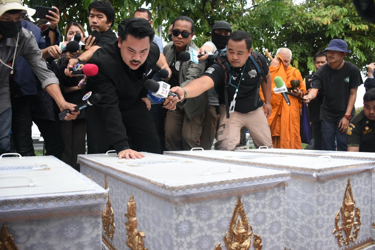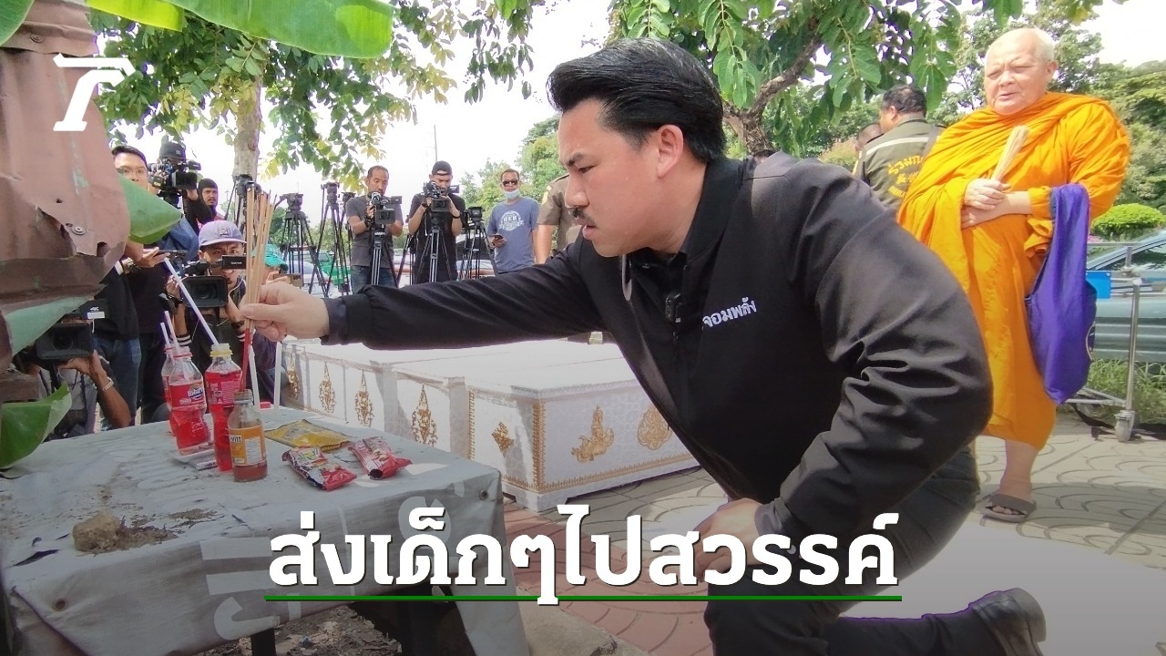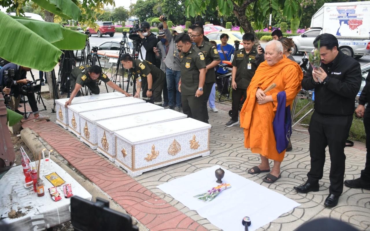 จากนั้น อาสามูลนิธิร่วมกตัญญูได้นำโลงศพเด็ก 5 โลงพร้อมเขียนชื่อ-นามสกุลลงบนฝาโลง มาวางที่หน้าศาลพระภูมิ ริมถนนพหลโยธิน ก่อนทำพิธีอัญเชิญดวงวิญญาณทั้งหมดเพื่อนำไปบำเพ็ญกุศล ในช่วงเวลา 14.00 น. วันนี้