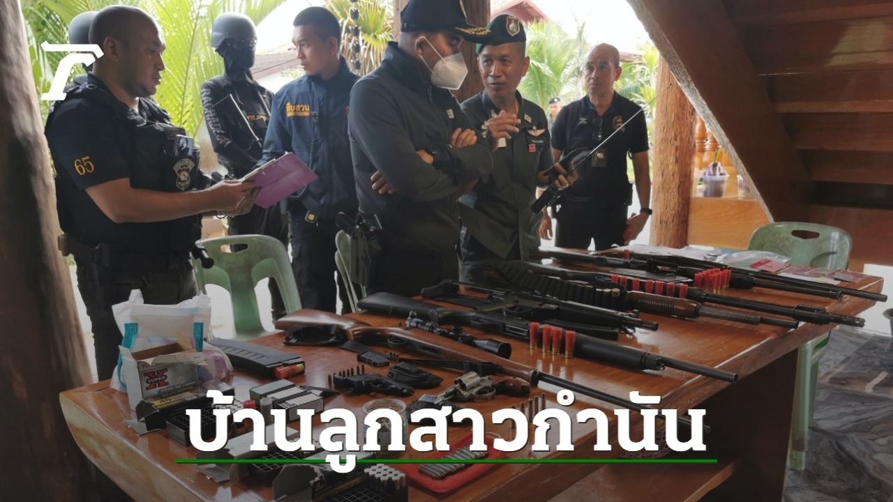 ทางเจ้าหน้าที่จึงได้ขอเข้าตรวจค้นบ้านซึ่งอยู่บริเวณเดียวกัน 3 หลัง และโกดังสินค้าเก็บยางพารา 3 จุด จากการตรวจค้นพบอาวุธปืนยาว 7 กระบอก อาวุธปืนสั้น 3 กระบอก พร้อมเครื่องกระสุนจำนวนมาก และยังพบซากหัวสัตว์ป่า อาทิ กระทิง กวาง อีกจำนวนหนึ่ง เจ้าหน้าที่จึงได้ทำการอายัดไว้ตรวจสอบทั้งหมด