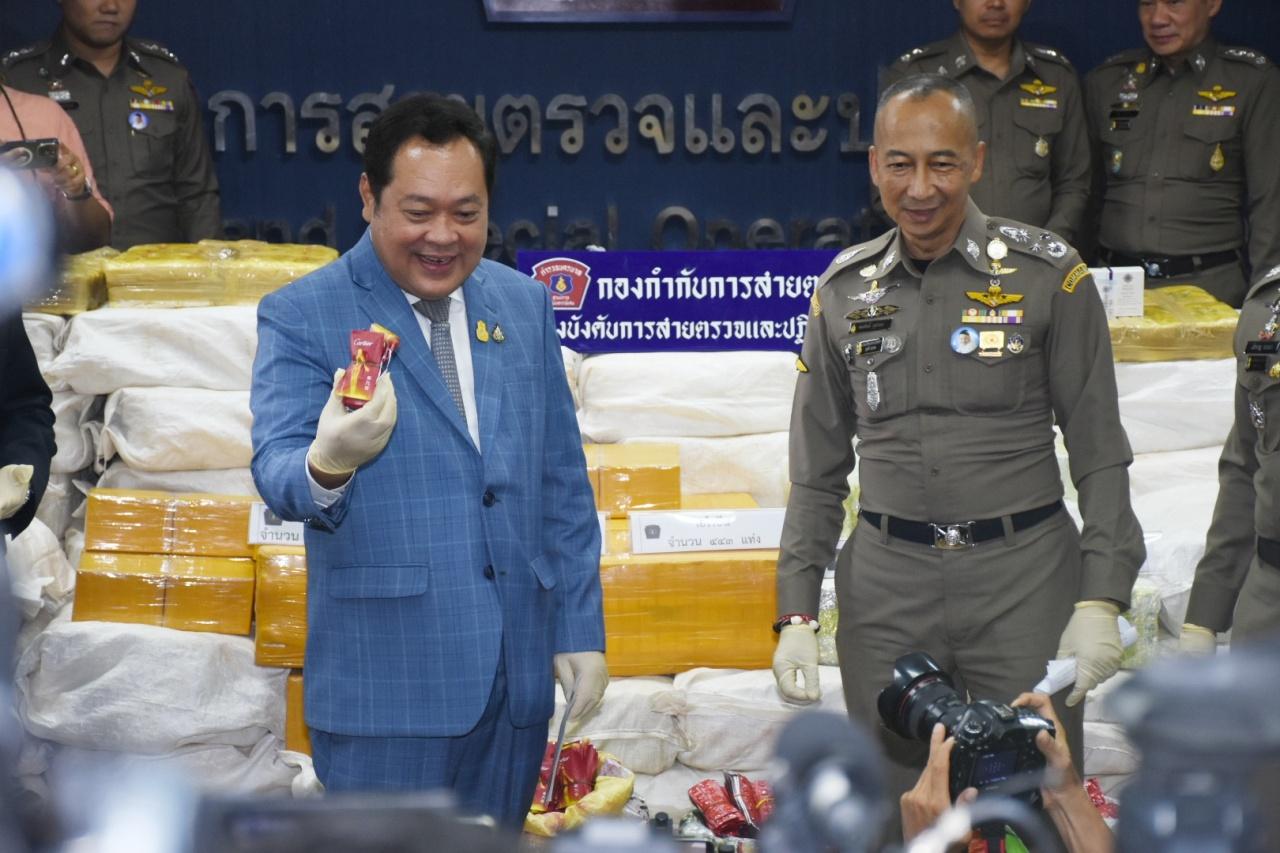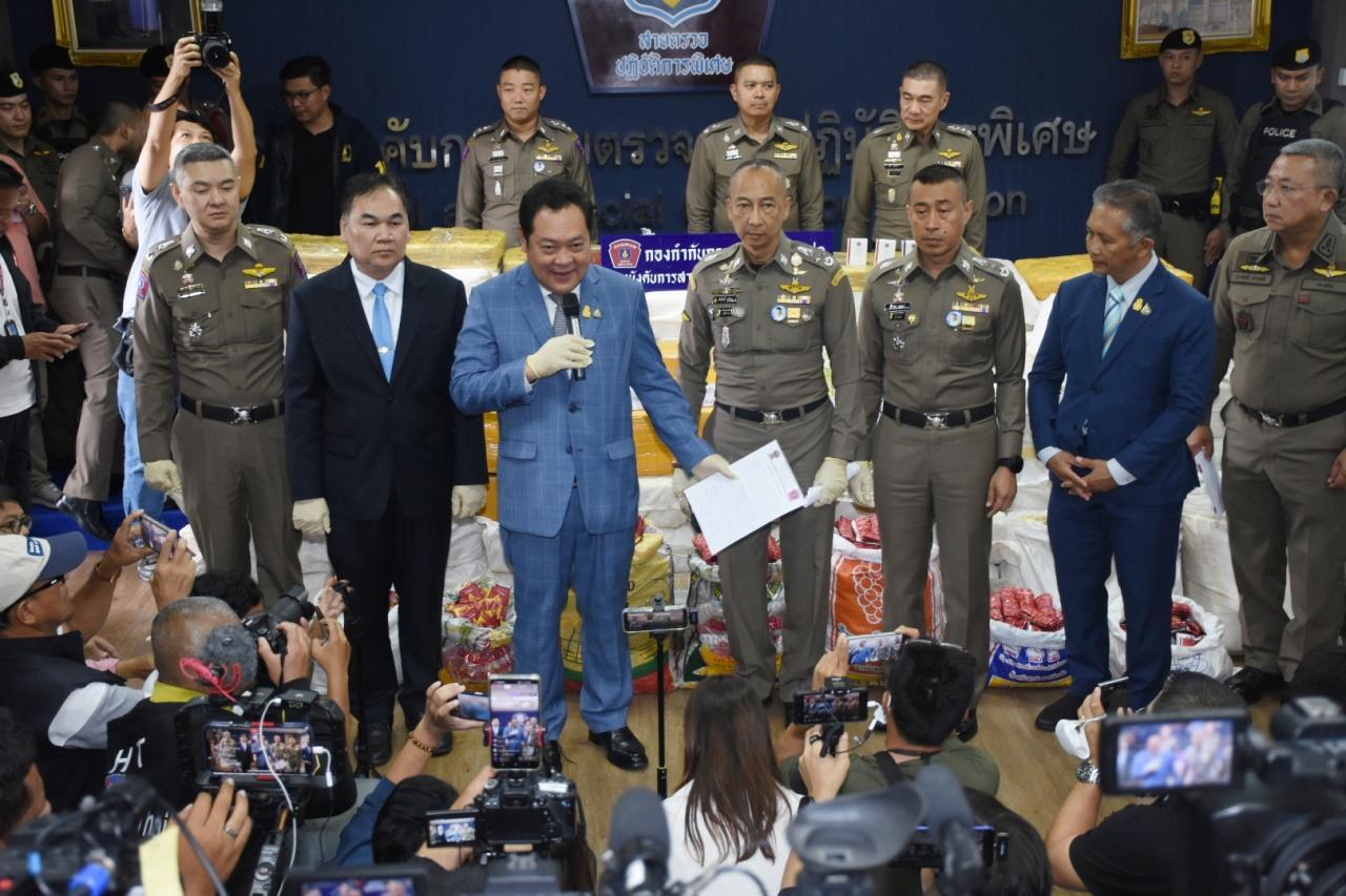 บิ๊กต่อ พล.ต.อ.ต่อศักดิ์ สุขวิมล ควง รมว.ยุติธรรม แถลงผลงานแรกหลัง ก.ตร. มีมติเลือกเป็น ผบ.ตร.คนที่ 14 ยืนยันการจับยาเสพติดลอตใหญ่ในพื้นที่จังหวัดนครปฐม ไม่ได้เป็นการจัดฉาก แต่อาชญากรรมสามารถเกิดขึ้นได้ทุกเวลา