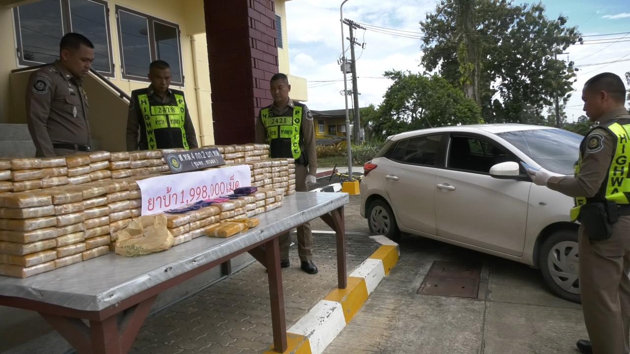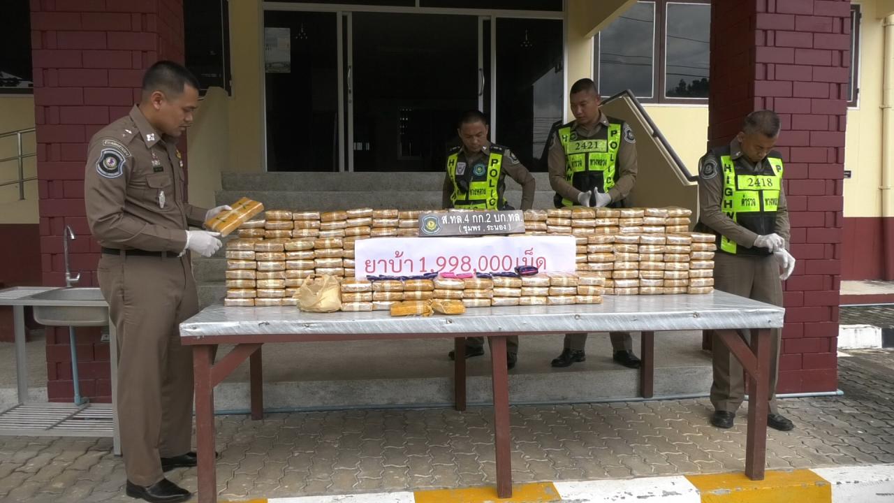ผลจากการการตรวจภายในรถเก๋งพบกระสอบที่ห่อหุ้มด้วยถุงพลาสติกสีดำ มีลักษณะเป็นก้อนสี่เหลี่ยมและมีน้ำหนักมาก วางอยู่ภายในบริเวณเบาะหลังที่นั่งคนขับ จำนวน 3 กระสอบ โดยมีผ้าห่มและที่นอนสำเร็จรูปห่อปกคลุมไว้ด้านบน และพบกระสอบที่ห่อหุ้มด้วยถุงพลาสติกสีดำมีลักษณะเป็นก้อนสี่เหลี่ยม อีกจำนวน 2 กระสอบ รวมเป็น 5 กระสอบ เมื่อเจ้าหน้าที่เกาะออกดูพบมียาบ้าชนิดเม็ดสีส้ม จำนวน 1,978,020 เม็ด และเป็นยาบ้าชนิดเม็ดสีเขียว จำนวน 19,980 เม็ด รวมเป็นยาบ้าทั้งหมด 1,998,000 เม็ด