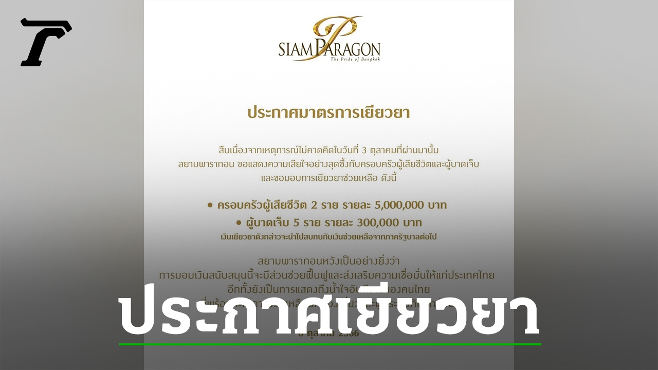 "สยามพารากอน" ประกาศมาตรการเยียวยา เหยื่อมือปืนวัย 14 บุกยิงภายในห้าง ผู้เสียชีวิต 2 ราย ได้รับรายละ 5 ล้านบาท-ผู้บาดเจ็บ 5 ราย ได้รับรายละ 3 แสนบาท
