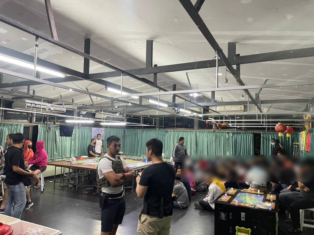 จุดที่เข้าตรวจค้นอยู่ภายในห้องกระจกกลางสนามฟุตซอล เจ้าหน้าที่ต้องใช้ความสามารถในการเข้าจับกุมครั้งนี้เป็นอย่างมาก เนื่องจากเป็นพื้นที่ปิดมีประตูเหล็กปิดทึบล็อกจากด้านในทุกด้าน อีกทั้งจุดที่มีการเล่นยังอยู่กลางพื้นที่ เมื่อเปิดห้องกระจกเข้าไปด้านในพบเป็นห้องโล่งมีม่านปิดรอบห้อง และพบนักพนันกำลังสนุกสนานกับกิจกรรมที่เล่น เจ้าหน้าที่จึงสั่งให้หยุดกิจกรรม และสามารถจับนักพนันได้จำนวน 53 คน แบ่งเป็น ชาย จำนวน 30 คน หญิง 23 คน พร้อมยึดของกลาง ถ้วยไฮโล 1 ถ้วย แปลนพนันกำถั่ว 1 แผ่น ลูกเต๋า 52 ลูก ไม้เขี่ยธนบัตร 25 ไม้ อุปกรณ์ ตรวจแม่เหล็ก 1 อัน ป้ายกติกาการเล่น 1 แผ่น กระดาษจดสถิติ 6 ใบ ตู้ยิงปลา 1 ตู้ มี น.ส.วิไลวรรณ ขาวขำ อายุ 37 ปี รับเป็นเจ้ามือ