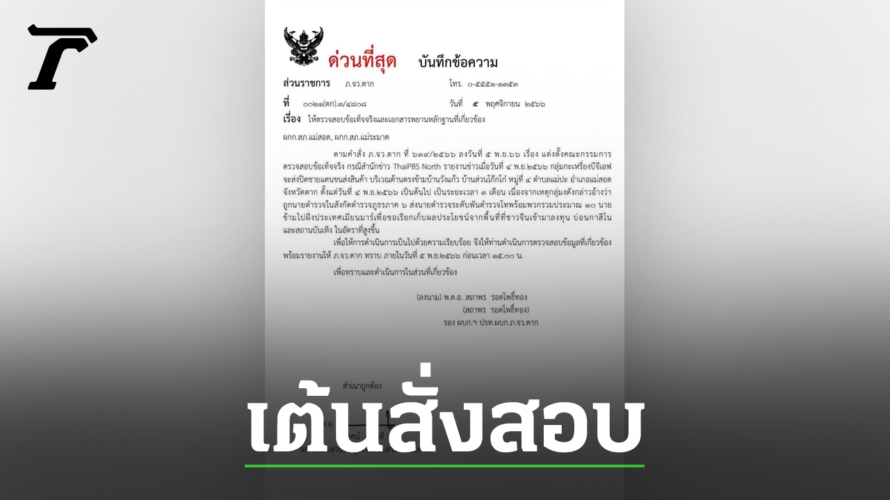 เมื่อวันที่ 5 พ.ย. 66 ผู้สื่อข่าวรายงานว่า พ.ต.อ.สถาพร รอดโพธิ์ทอง รอง ผบก.ฯ ปรท.ผบก.ภ.จว.ตาก ได้มีคำสั่ง 0021(ตก).3/4808 ลงวันที่ 5 พ.ย. 2566 เรื่อง ให้ตรวจสอบข้อเท็จจริงและเอกสารพยานหลักฐานที่เกี่ยวข้องไปยัง ผกก.สภ.แม่สอด และ ผกก.สภ.แม่ระมาด ดังนี้ว่า