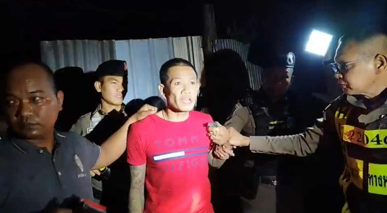 กระทั่งเวลา 20.00 น. พ.ต.ต.วรฉัตร ฉลวยแสง สว.ส.ทล.2 กก.2 บก.ทล., ร.ต.อ.สมศักดิ์ ทรัพย์เล็ก, ด.ต.ไพศาล เจริญเรืองทรัพย์, ด.ต.สายัณห์ แก้วอนันต์, ด.ต.จิรวัฒน์ แตงจุ้ย, สายตรวจตำรวจทางหลวง วังมะนาว พบเห็นรถคันดังกล่าวบนถนนเพรชเกษม บริเวณกม.ที่ 123 ต.วังมะนาว อ.ปากท่อ จ.ราชบุรี จึงขับรถเข้าแสดงตัว แต่ผู้ต้องหาได้ขับรถหลบหนีย้อนศรเข้าสี่แยกปากท่อ เจ้าหน้าที่จึงได้เร่งติดตามอย่างรวดเร็ว และได้ประสานงานแจ้งเจ้าหน้าที่ตำรวจสภ.ปากท่อ ร่วมสกัดจับ จนผู้ต้องหาได้เลี้ยวรถเข้าไปถนนซอยตัน ถนนเลียบทางรถไฟ ต.ปากท่อ รถได้พุ่งลงไปในคูน้ำ คนร้ายทราบชื่อต่อมาชื่อ นายธีรวิชญ์ คำสุวรรณ อายุ 39 ปี อยู่หมู่ 14 ต.ไร่ขิง อ.สามพราน จ.นครปฐม ได้เปิดประตูรถวิ่งหนีเข้าไปในป่ากก ตำรวจทางหลวงวังมะนาวบูรณาการร่วมกับชุดสืบสวน สภ.ปากท่อ นำกำลังค้นหาผู้ที่หลบหนีเข้าไปในป่า ใช้เวลาประมาณ 3 ชั่วโมง จึงพบตัวผู้ก่อเหตุหลบหนีแอบอยู่บ้านคนบริเวณริมทางรถไฟปากท่อ ขโมยเสื้อผ้าเจ้าของบ้านเอามาใส่เปลี่ยนจากชุดเดิม นั่งอยู่ในบ้านทำเหมือนไม่มีอะไรเกิดขึ้น เจ้าหน้าที่เห็นผิดปกติจึงเรียกออกมา แต่คนร้ายอ้างว่าเดินหลงมาผิดบ้าน จะมาหาเพื่อนแถวนี้ ทั้งๆ ที่เจ้าของบ้านยังงงอยู่ว่าเป็นใคร เข้ามาได้ยังไง