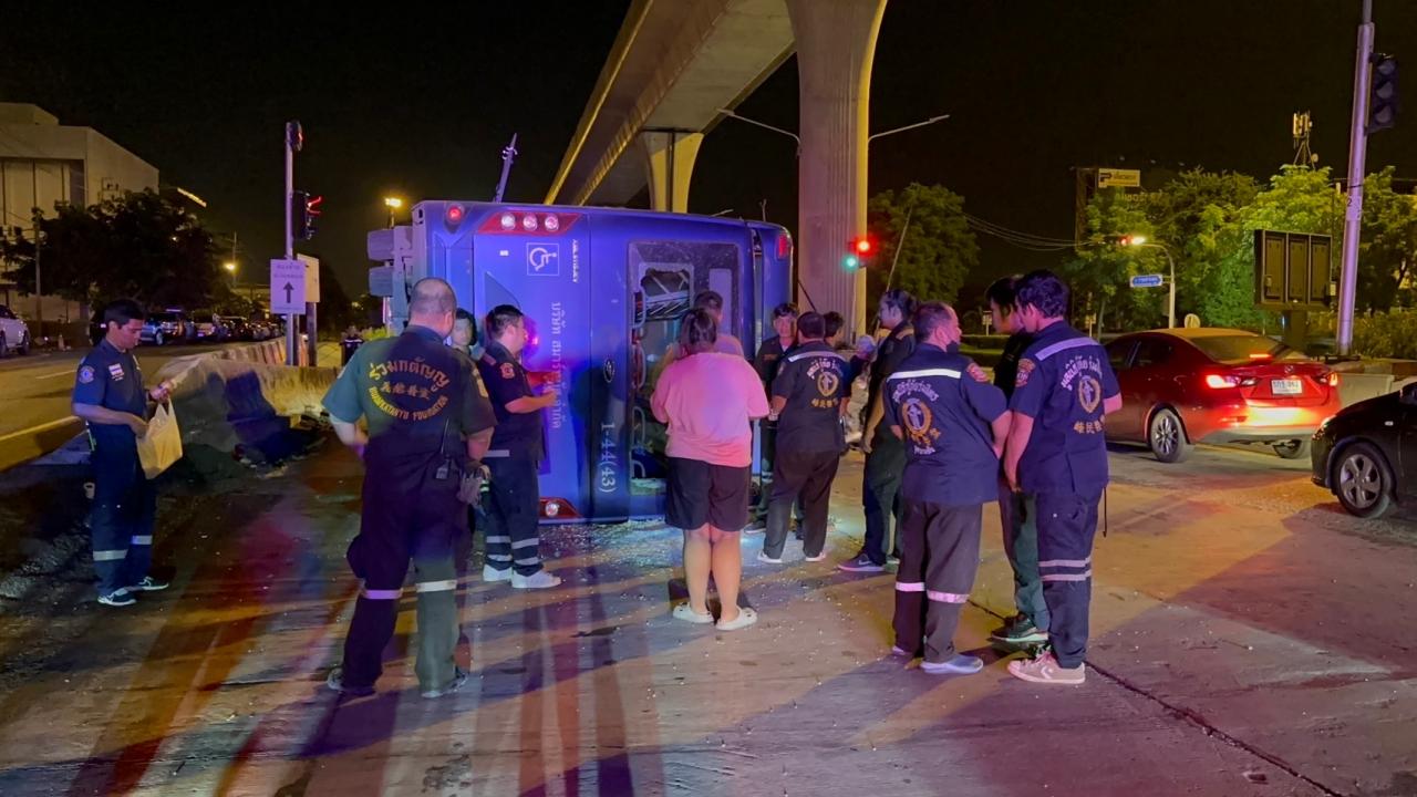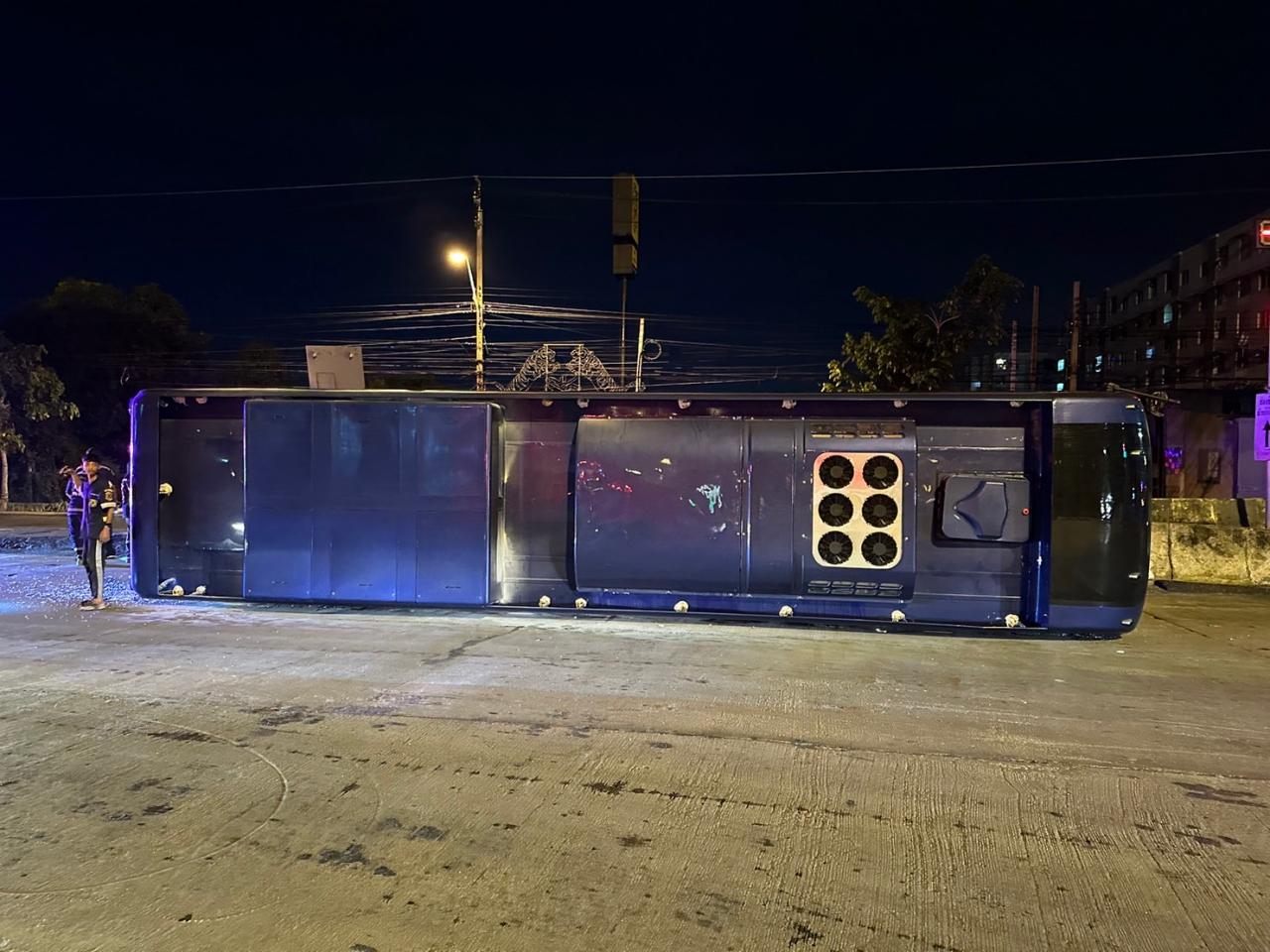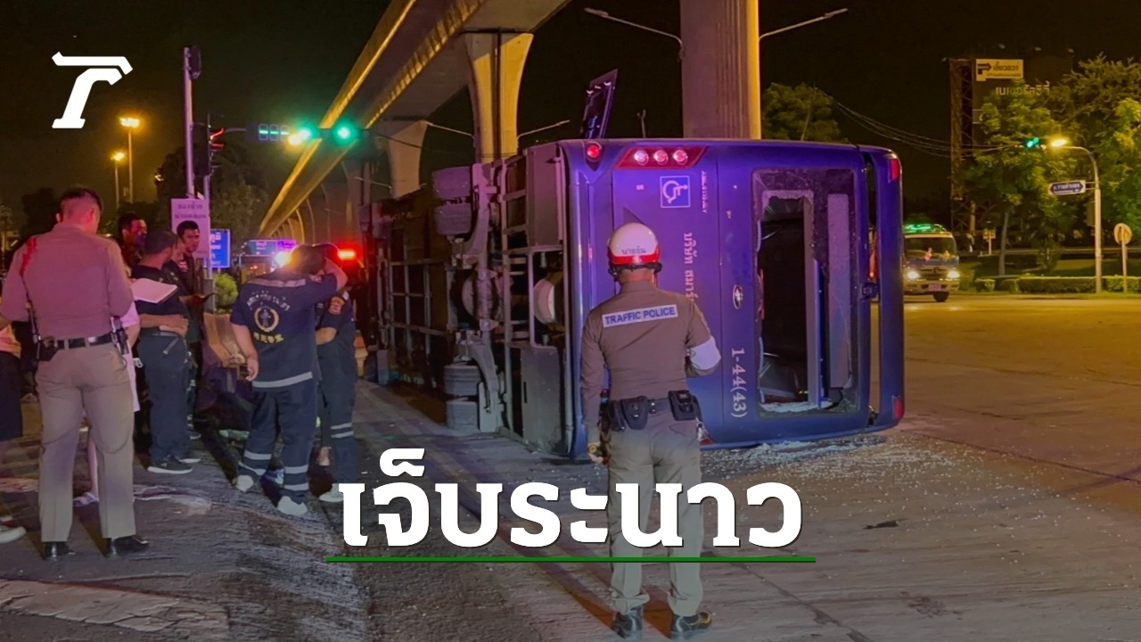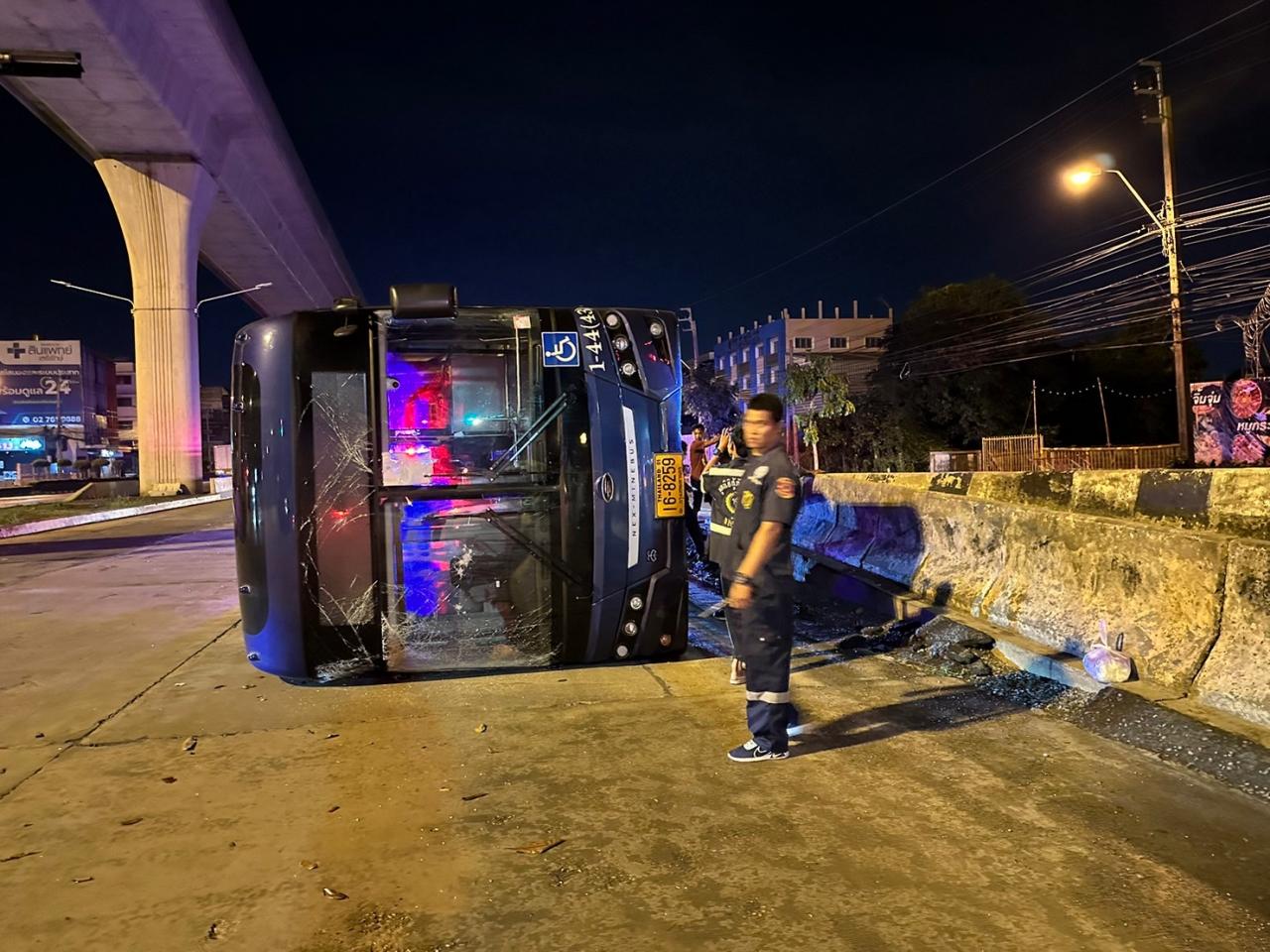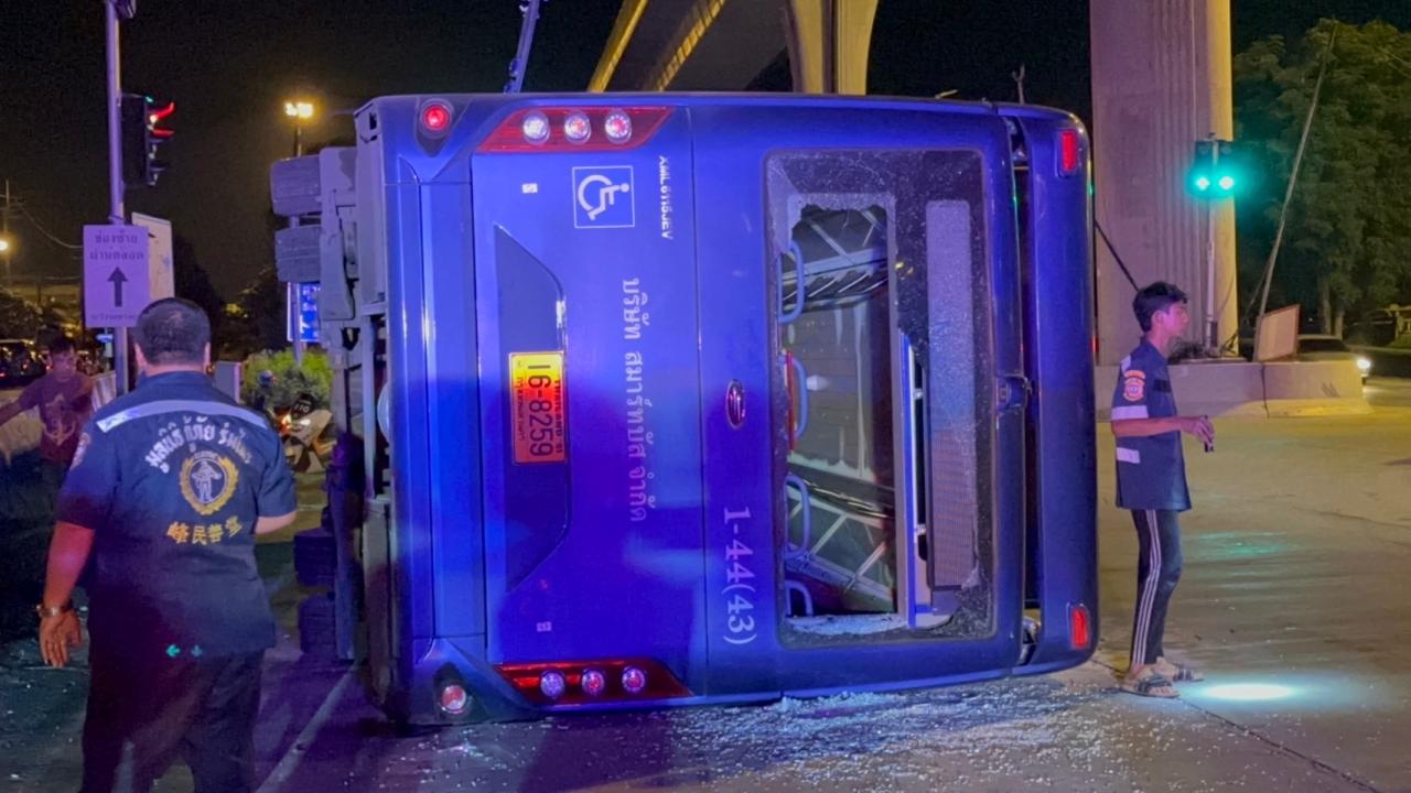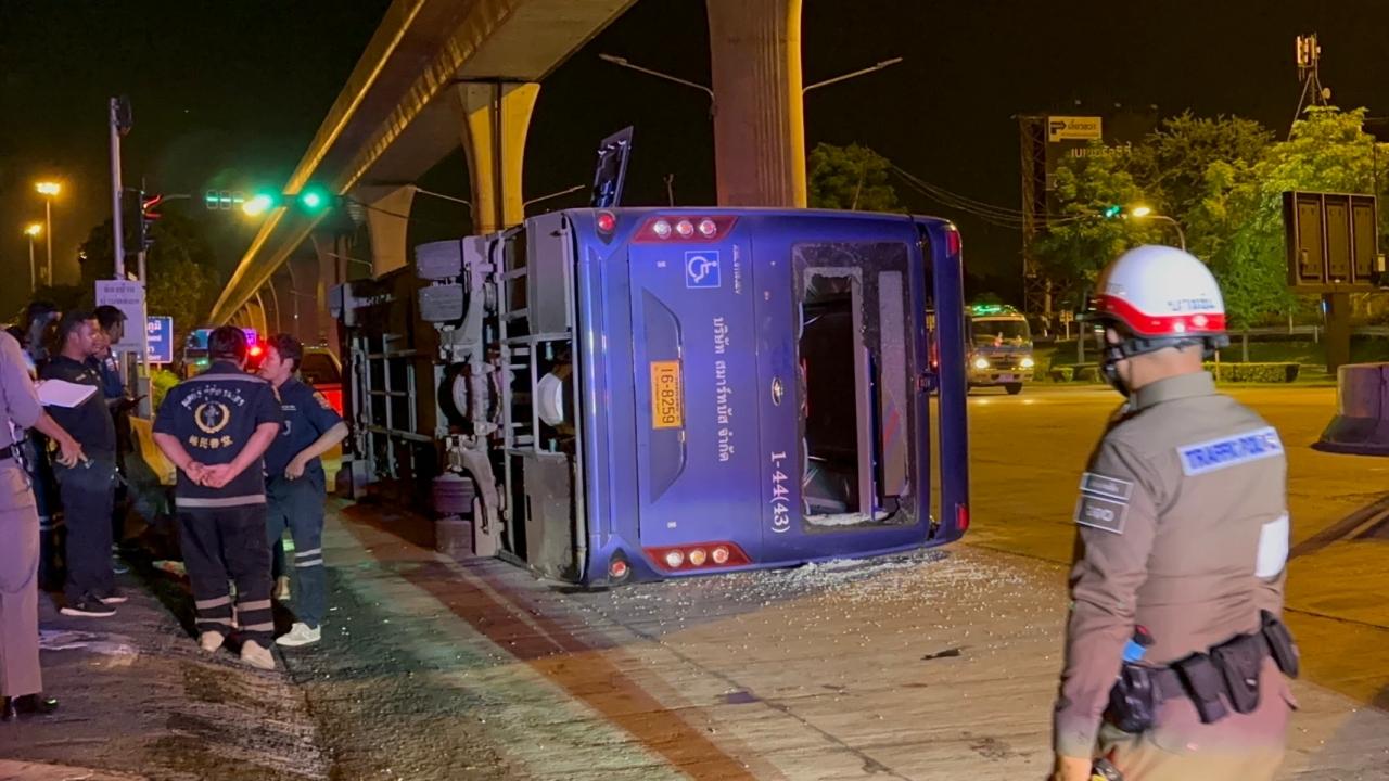 รถเมล์สาย 113 มีนบุรี-หัวลำโพง พลิกคว่ำ มีผู้โดยสารบาดเจ็บนับ 10 ราย ด้านคนขับให้การกับกู้ภัยว่าถนนลื่นจากน้ำฝน ทั้งยังเป็นทางต่างระดับ จึงเสียการควบคุม ตำรวจรอผลตรวจเลือดหาสารเสพติด และแอลกอฮอล์ในร่างกาย