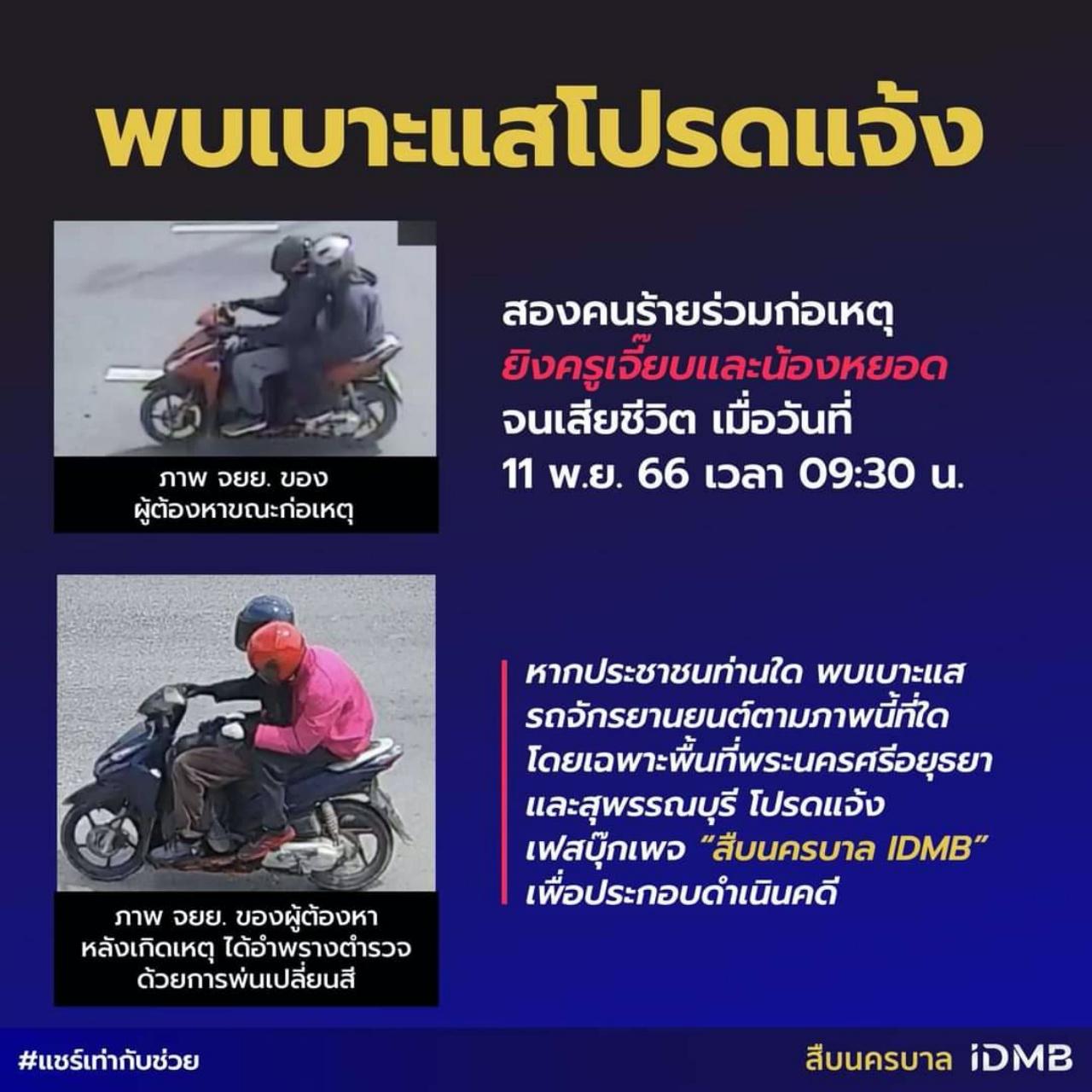 ทั้งนี้ สืบนครบาลขอความร่วมมือประชาชน หากท่านใดพบเห็นรถจักรยานยนต์ตามภาพนี้ที่ใด โดยเฉพาะพื้นที่พระนครศรีอยุธยา และสุพรรณบุรี โปรดแจ้งเฟซบุ๊กเพจ “สืบนครบาล IDMB” เนื่องจากผู้ต้องหารายนี้มีส่วนเกี่ยวข้องกับเหตุยิงครูเจี๊ยบ และน้องหยอด จนเสียชีวิต บริเวณแขวงพระโขนง เขตคลองเตย กรุงเทพมหานคร เมื่อวันที่ 11 พ.ย. 66 เวลา 09:30 น. หลังจากก่อเหตุได้อำพรางเจ้าหน้าที่ตำรวจด้วยการพ่นเปลี่ยนสีรถ จยย. และเครื่องแต่งกาย ข้อมูลของท่านอาจเป็นประโยชน์เพื่อประกอบการดำเนินคดี