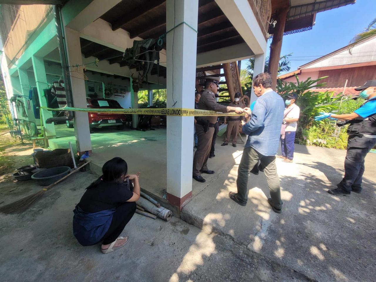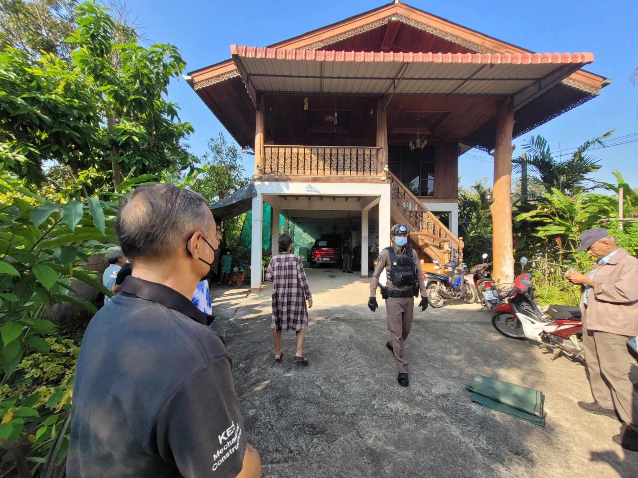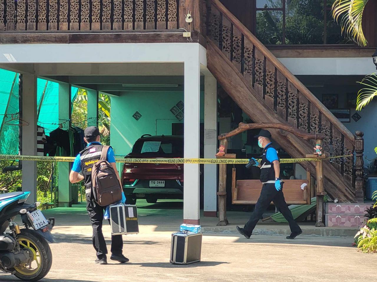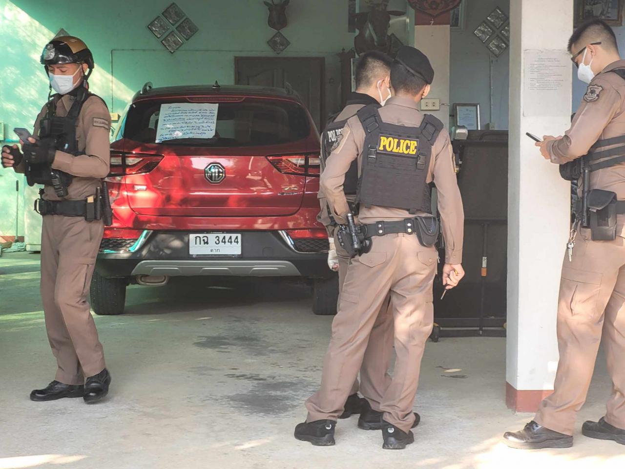 เมื่อเจ้าหน้าที่เดินทางไปถึงในจุดเกิดเหตุพบชาวบ้านจำนวนมากมามุงดูเหตุการณ์เต็มถนนหน้าบ้านหลังดังกล่าว และภายในบ้านเป็นบ้านไม้สักหลังใหญ่สองชั้น เจ้าหน้าที่จึงรีบปิดกั้นจุดเกิดเหตุไม่ให้ผู้ไม่เกี่ยวข้องเข้าไปโดยเด็ดขาด จากนั้นเจ้าหน้าที่ร่วมกันเข้าตรวจสอบใต้ถุนบ้านพบรถยนต์เก๋ง ยี่ห้อเอ็มจี สีแดง หมายเลขทะเบียน กฉ-3444 ตาก โดยที่กระจกด้านหลังรถยนต์คันดังกล่าวพบกระดาษสีขาวแผ่นใหญ่มีข้อความเขียนสั่งเสียมีข้อความดังนี้