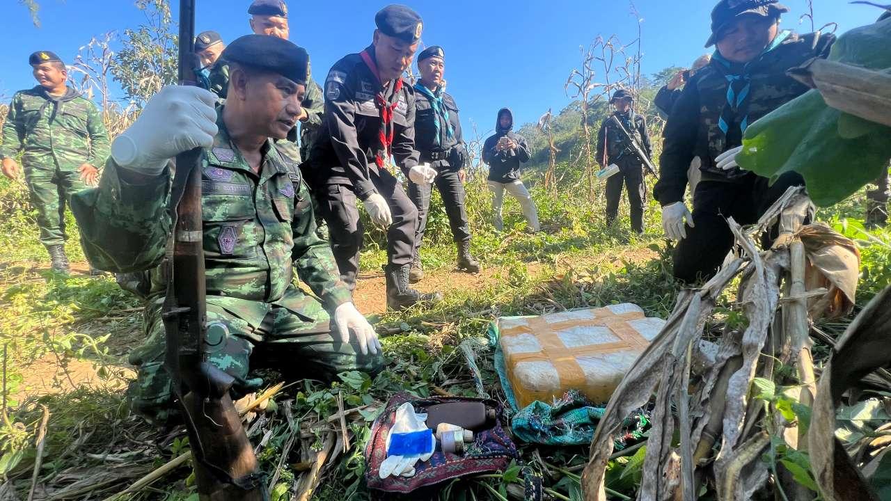 จนกระทั่งเวลา 03.30 น. วันนี้ (2 ม.ค.) ได้ตรวจพบกลุ่มบุคคลต้องสงสัย จำนวน 3 - 5 คน สะพาย กระเป๋าเป้สัมภาระดัดแปลงเดินมาตามเส้นทางในภูมิประเทศ เจ้าหน้าที่จึงได้แสดงตัวเพื่อขอทำการตรวจค้น แต่กลุ่มบุคคลดังกล่าวได้ใช้อาวุธปืนไม่ทราบชนิดและขนาด ยิงใส่เจ้าหน้าที่ จึงเกิดการปะทะกันประมาณ 5 นาที เจ้าหน้าที่ปลอดภัย จึงได้ทำการตรวจสอบพื้นที่ พบกระสอบเป้ จำนวน 2 เป้ ภายในบรรจุยาเสพติดให้โทษประเภท 1 (ยาบ้า) จำนวน 200,000 เม็ด, ถุงพลาสติกสีฟ้าแบบปิดภายในบรรจุยาเสพติดให้โทษประเภท 1 (ยาบ้า) จำนวน 18 เม็ด, ถุงย่าม จำนวน 1 ถุง ด้านในบรรจุอุปกรณ์ปืนดัดแปลง, อาวุธปืนยาวดัดแปลง จำนวน 1 กระบอก และปลอก กระสุนปืน เอเค 47 ขนาด 7.62 มม. จำนวน 3 ปลอก