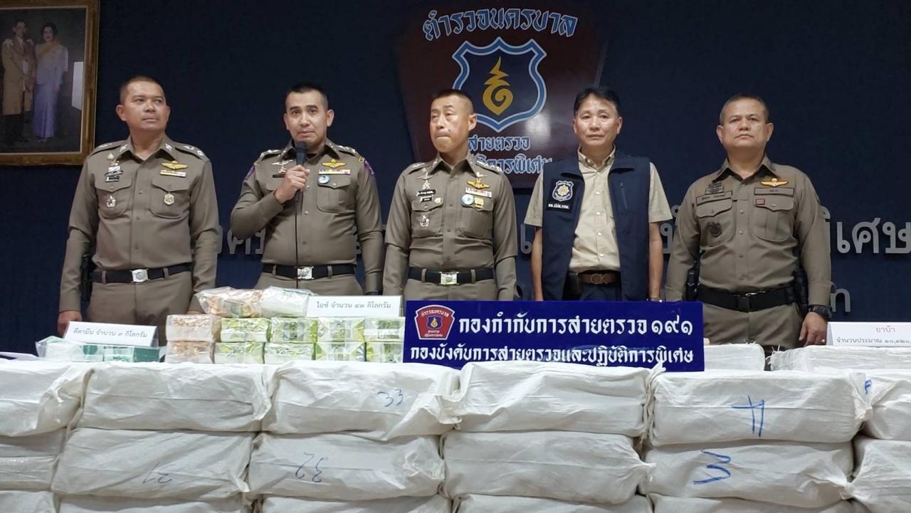 ประกอบด้วย นายธนวุฒิ หรือบอม รักเดช อายุ 38 ปี นายพลเชฏฐ์ หรือดำ อ่อนศรีทอง อายุ 36 ปี และนายณัฐพล หรืออ้น สุลาลัย อายุ 28 ปี พร้อมด้วยของกลาง ยาบ้า จำนวน 10,320,000 เม็ด ยาไอซ์ จำนวน 43 กิโลกรัม คีตามีน จำนวน 3 กิโลกรัม รถยนต์ จำนวน 6 คัน รถจักรยานยนต์ จำนวน 2 คัน โทรศัพท์มือถือ จำนวน 4 เครื่อง