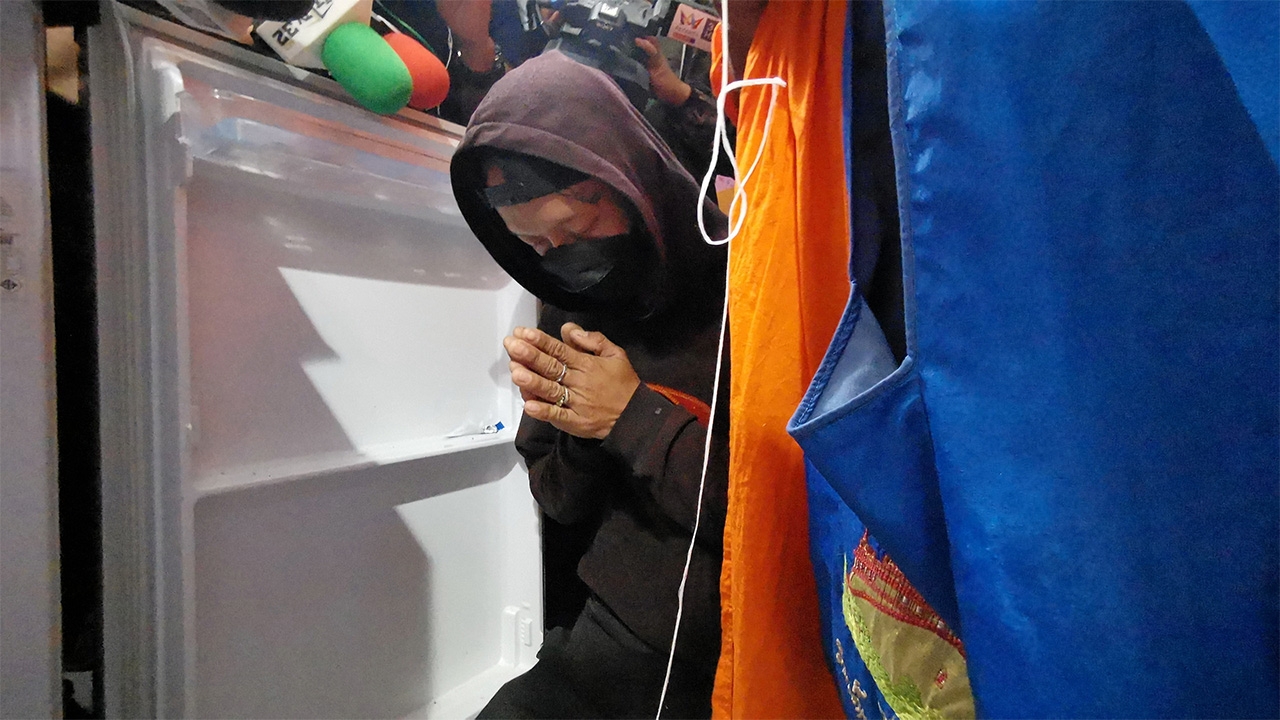 บิดา “น้องไนท์” (นามสมมติ) วัย 2 ขวบเศษ นิมนต์พระเชิญวิญญาณลูกชายออกจากตู้เย็นในห้องนอนบ้านเลขที่ 2/613 ซอย 11/2 หมู่บ้านรัตนาธิเบศร์ ต.บางรักพัฒนา อ.บางบัวทอง จ.นนทบุรี เพื่อไปบำเพ็ญกุศล หลังผลชันสูตรยันเด็กขาดอากาศหายใจเพราะข้าว เหนียวอุดหลอดลม ด้านคดี ตำรวจนำ 2 ผัวเมียผู้ดูแลเด็กส่งศาลฝากขัง.