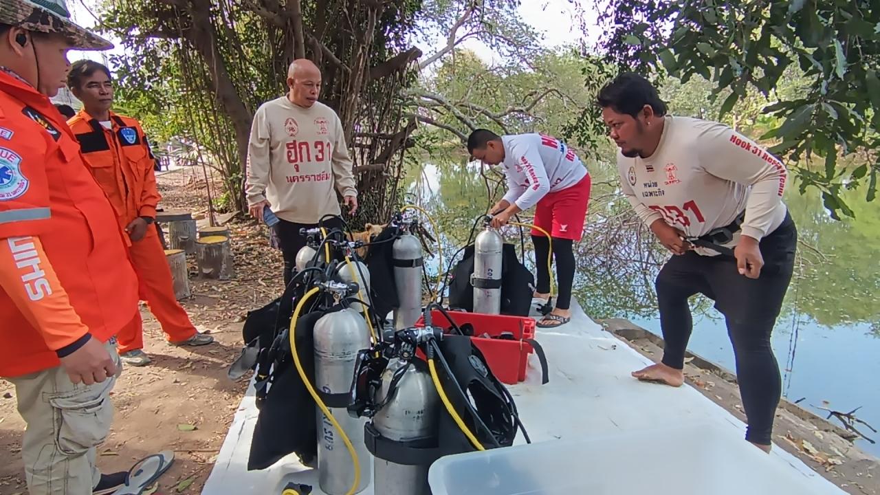 ทางเจ้าหน้าที่กู้ภัยฮุก 31 นครราชสีมาได้ใช้ชุดประดาน้ำ 5 ราย เริ่มทำการดำน้ำค้นหาเมื่อเวลา 10.00 น. ท่ามกลางบรรดาญาติพี่น้องและชาวบ้านในละแวกใกล้เคียงที่มามุงดูเหตุการณ์และให้กำลังใจเจ้าหน้าที่และครอบครัวของผู้สูญหายนับร้อยชีวิต โดยทางชุดประดาน้ำได้ใช้วิธีดำหน้ากระดานค้นหาริมขอบสระน้ำโดยรอบ เพราะสระน้ำนั้นค่อนข้างกว้างไม่มีเรือ คาดว่าจะต้องใช้เวลาประมาณ 2-3 ชั่วโมง