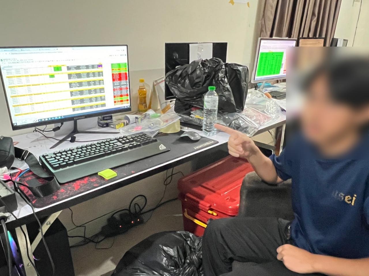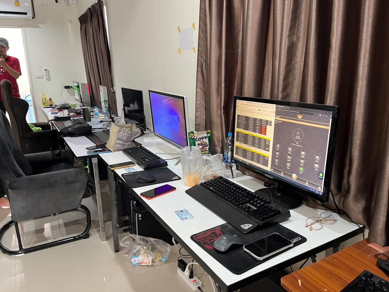 ที่เกิดเหตุเป็นบ้านทาวน์เฮาส์ 2 ชั้น ที่ชั้นล่างพบมีโต๊ะวางคอมพิวเตอร์ และคอมพิวเตอร์วางเรียงกันจำนวน 11 เครื่อง พบมีพนักงาน 9 คน กำลังนั่งเล่นพนันออนไลน์ เจ้าหน้าที่จึงแสดงหมายเข้าตรวจค้น เบื้องต้นเจ้าหน้าที่ตรวจยึด โต๊ะคอมพิวเตอร์ กล้องวงจรปิดภายในบ้าน เครื่องคอมพิวเตอร์จำนวน 11 เครื่อง ซิมโทรศัพท์มือถือ โทรศัพท์มือถือ และสมุดบัญชีธนาคารพร้อมบัตรกดเงิน (ATM) อีกจำนวนมากไว้เป็นหลักฐาน