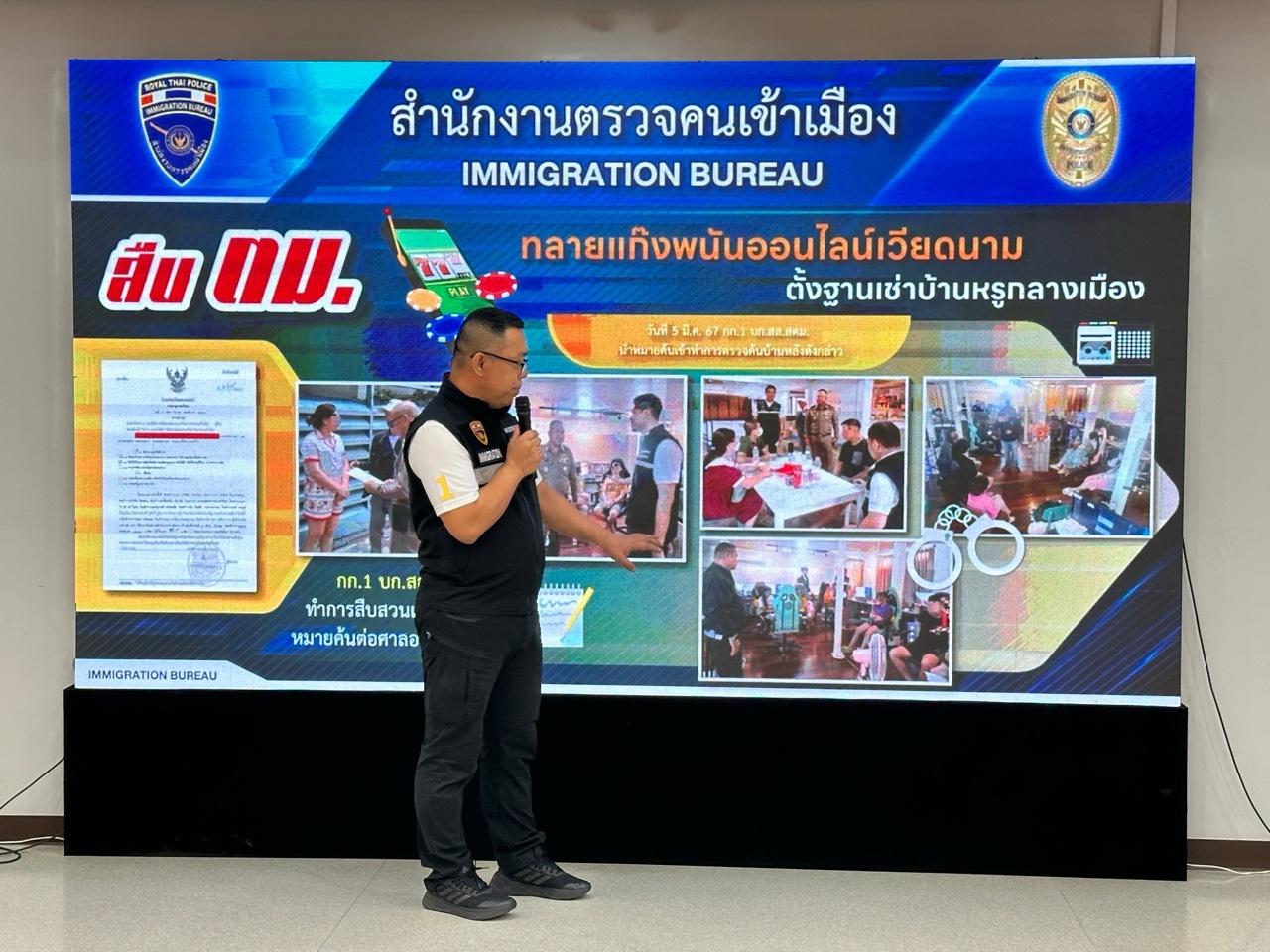 สืบสวน ตม.เข้าตรวจค้นบ้านหรูย่านพระราม 9 รวบแก๊งทำเว็บพนันออนไลน์ ชาวเวียดนาม พร้อมพวก รวม 18 คน รับสารภาพทำงานเป็นแอดมิน ชักชวนลูกค้า แบ่งเวลากันทำงานตลอด 24 ชั่วโมง นายทุนใหญ่ จ่ายค่าจ้างเดือนละ 2 หมื่นบาท