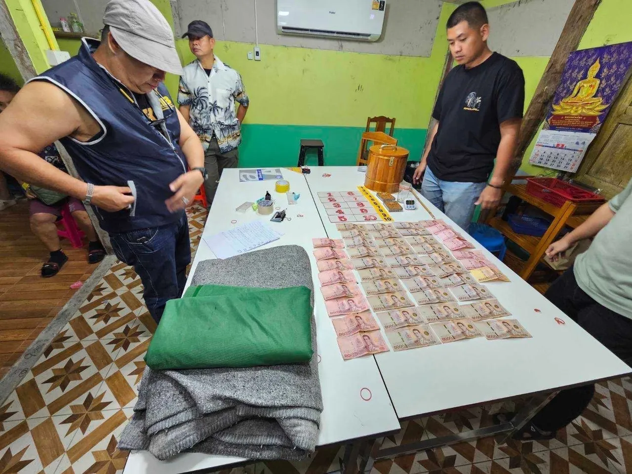 ทั้งนี้จากการเข้าตรวจสอบพบบ้านหลังดังกล่าว พบมีกลุ่มนักพนันจำนวนมาก กำลังนั่งล้อมวงเล่นพนันไพ่ป๊อกเด้ง จึงวางแผนกระจายกำลังเข้าปิดล้อม ก่อนแสดงตัวเข้าจับกุม เบื้องต้นสามารถจับกุมนักพนันได้ จำนวน 36 ราย พร้อมของกลางเงินสดประมาณ 30,000 บาท ไพ่ 2 สำรับ กระดานตัวเลข 1 ชุด ลูกเต๋า 2 ลูก