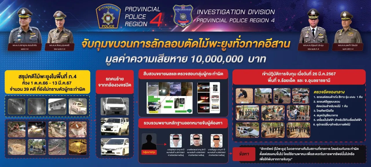 ผบช.ภ.4 กล่าวถึงการจับกุม ผู้ต้องหาทั้ง 3 คน ในครั้งนี้ เนื่องจากว่าตั้งแต่เดือนตุลาคม 2566 ถึงเดือนมีนาคม 2567 มีการลักลอบตัดไม้พะยูงที่อยู่ในพื้นที่วัด โรงเรียน ที่มีการรักษาไม้พะยูงเอาไว้ โดยในพื้นที่ตำรวจภูธรภาค 4 นั้นมีการก่อเหตุรวมจำนวน 39 คดี จึงสั่งการให้ กองบังคับการตำรวจสืบสวนสอบสวนภาค 4 ทำการสืบสวนรวบรวมพยานหลักฐาน เพื่อหาตัวกลุ่มคนก่อเหตุลักลอบตัดไม้พะยูงเนื่องจากเกิดเหตุในหลายจังหวัดต่อเนื่องกัน