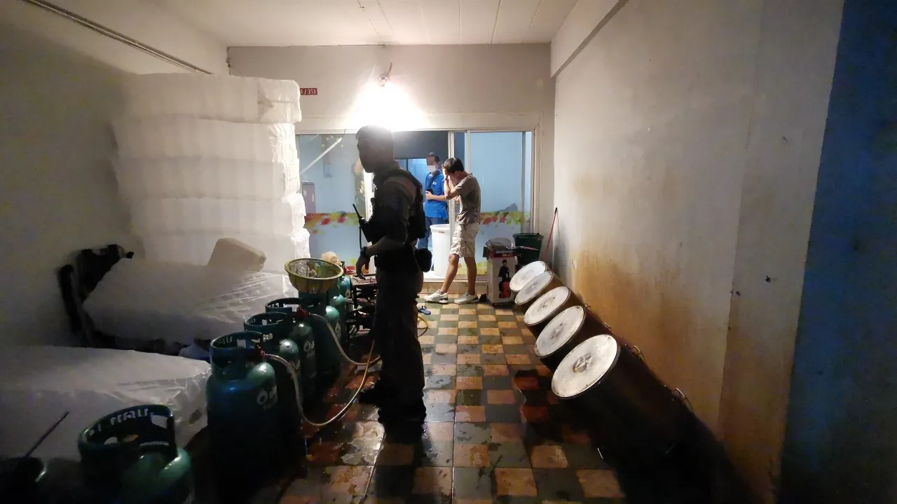 จากการนำกำลังเข้าตรวจสอบภายในบ้านพักหลังดังกล่าว พบอุปกรณ์การต้มน้ำกระท่อม หม้อ 7 ใบ หัวเตา 4 หัว ถังแก๊ส 9 ถัง ใบกระท่อม 10 ถุง ขวดน้ำเปล่า 4,800 ขวด ยาแก้ไอ 346 ขวด น้ำกระท่อมต้มมาแล้วแช่อยู่ในลังน้ำแข็ง 200 ขวด และน้ำต้มแล้วที่รอการบรรจุ จึงได้ทำการยึดอายัดอุปกรณ์ทั้งหมด รวมทั้งน้ำกระท่อมสำเร็จรูป พร้อมกับควบคุมตัวนายจักรกริช ซึ่งรับสารภาพว่าเป็นผู้ลักลอบผลิตน้ำกระท่อมสำเร็จรูปขาย มาทำการสอบสวนต่อที่โรงพัก สภ.บางบัวทอง