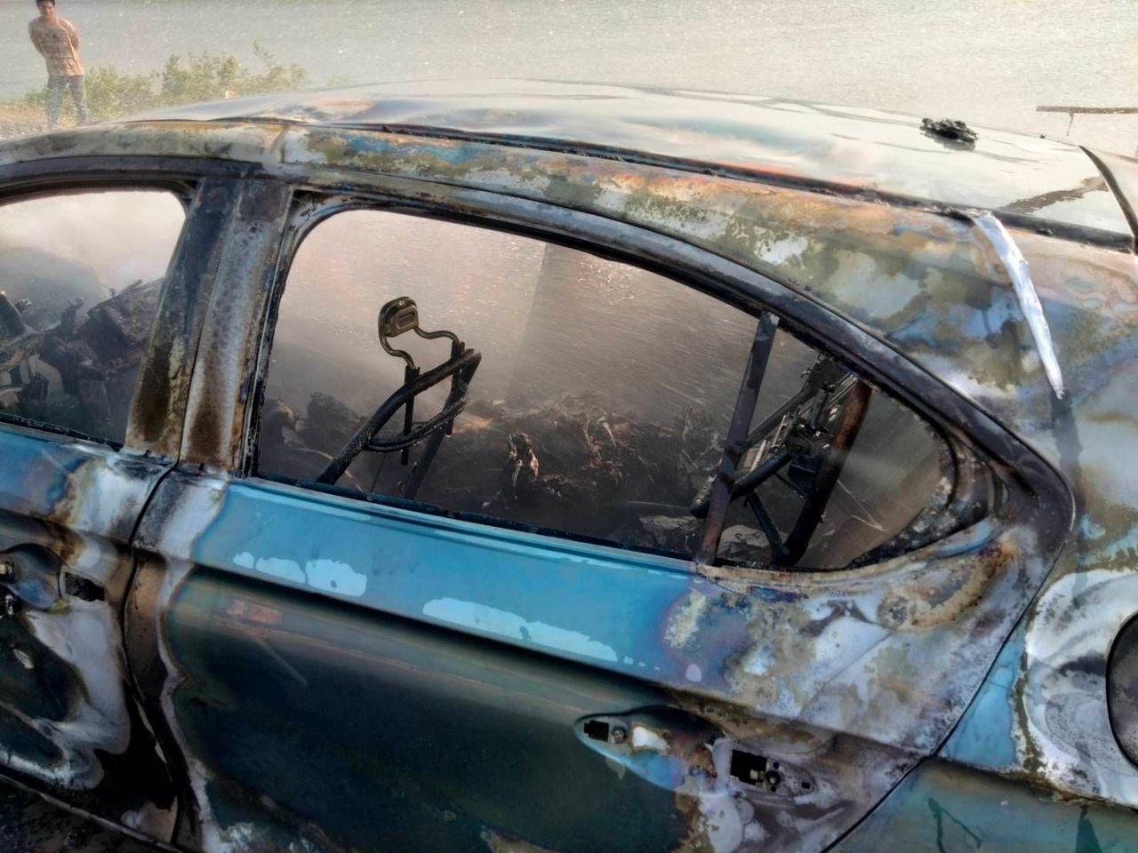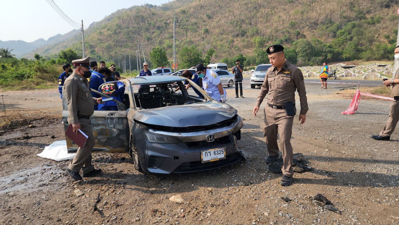 ในที่เกิดเหตุพบรถยนต์เก๋ง ฮอนด้า ซีวิค สีเทาดำ หมายเลขทะเบียน กร 6325 ราชบุรี จอดอยู่ริมถนน มีกลุ่มควันลอยออกมาจากกระจกประตูฝั่งคนขับ เจ้าหน้าที่พยายามจะเปิดประตูเข้าไปตรวจสอบภายในรถ แต่ปรากฏว่าประตูรถถูกล็อกจากด้านใน เจ้าหน้าที่จึงตัดสินใจใช้อุปกรณ์งัดประตูรถออก เมื่อเปิดประตูรถได้ พบว่าภายในรถมีกลุ่มควันอยู่เป็นจำนวนมาก และพบร่างชายคนหนึ่ง นอนอยู่ที่เบาะนั่งฝั่งคนขับ ตรวจสอบไม่พบชีพจร คาดว่าเสียชีวิตแล้ว โดยที่บริเวณลำคอของผู้เสียชีวิต มีบาดแผลขนาดใหญ่ คล้ายถูกของมีคมบาดมีเลือดไหลออกมาเป็นจำนวนมาก แต่ยังไม่ทันที่เจ้าหน้าที่จะนำร่างของชายคนดังกล่าวออกมาจากรถ ก็ได้เกิดเปลวไฟเริ่มลุกไหม้จากเบาะด้านหลังรถและลุกลามอย่างรวดเร็ว ทำให้เจ้าหน้าที่ต้องวิ่งหนีเอาชีวิตรอดกันอย่างอุตลุดก่อนจะประสานรถดับเพลิงจาก อบต.เขาน้อย มาช่วยฉีดน้ำดับเพลิงที่กำลังลุกไหม้รถได้สำเร็จ