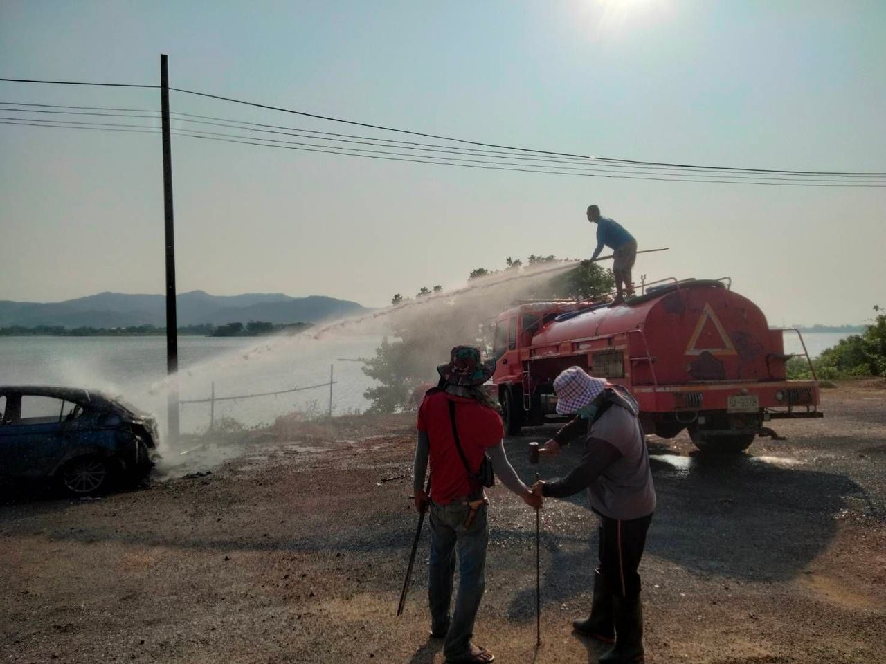 ขณะที่ นายสุธี มโนชานันท์ เจ้าหน้าที่มูลนิธิขุนรัตนาวุธ กล่าวว่า หลังเปิดประตูรถได้ ก็พบร่างของผู้เสียชีวิตนอนอยู่ที่เบาะคนขับ ตรวจสอบไม่พบชีพจร แต่พบบาดแผลมีเลือดไหลที่บริเวณลำคอ โดยภายในรถไม่พบว่ามีคนอื่นอยู่ นอกจากผู้เสียชีวิต แต่ยังไม่ทันจะนำร่างผู้เสียชีวิตออกมา ก็เกิดเพลิงลุกไหม้รถขึ้นเสียก่อน ทำให้เจ้าหน้าที่และชาวบ้านต่างรีบหนีเอาชีวิตรอด ก่อนประสานรถดับเพลิงเข้าฉีดน้ำดับเพลิงได้สำเร็จ
