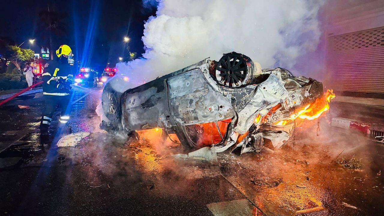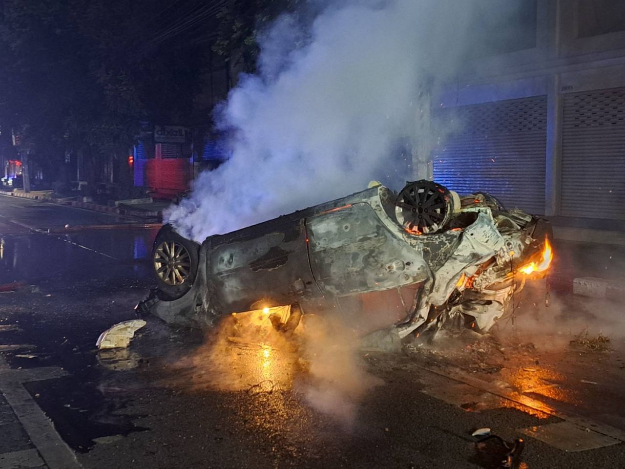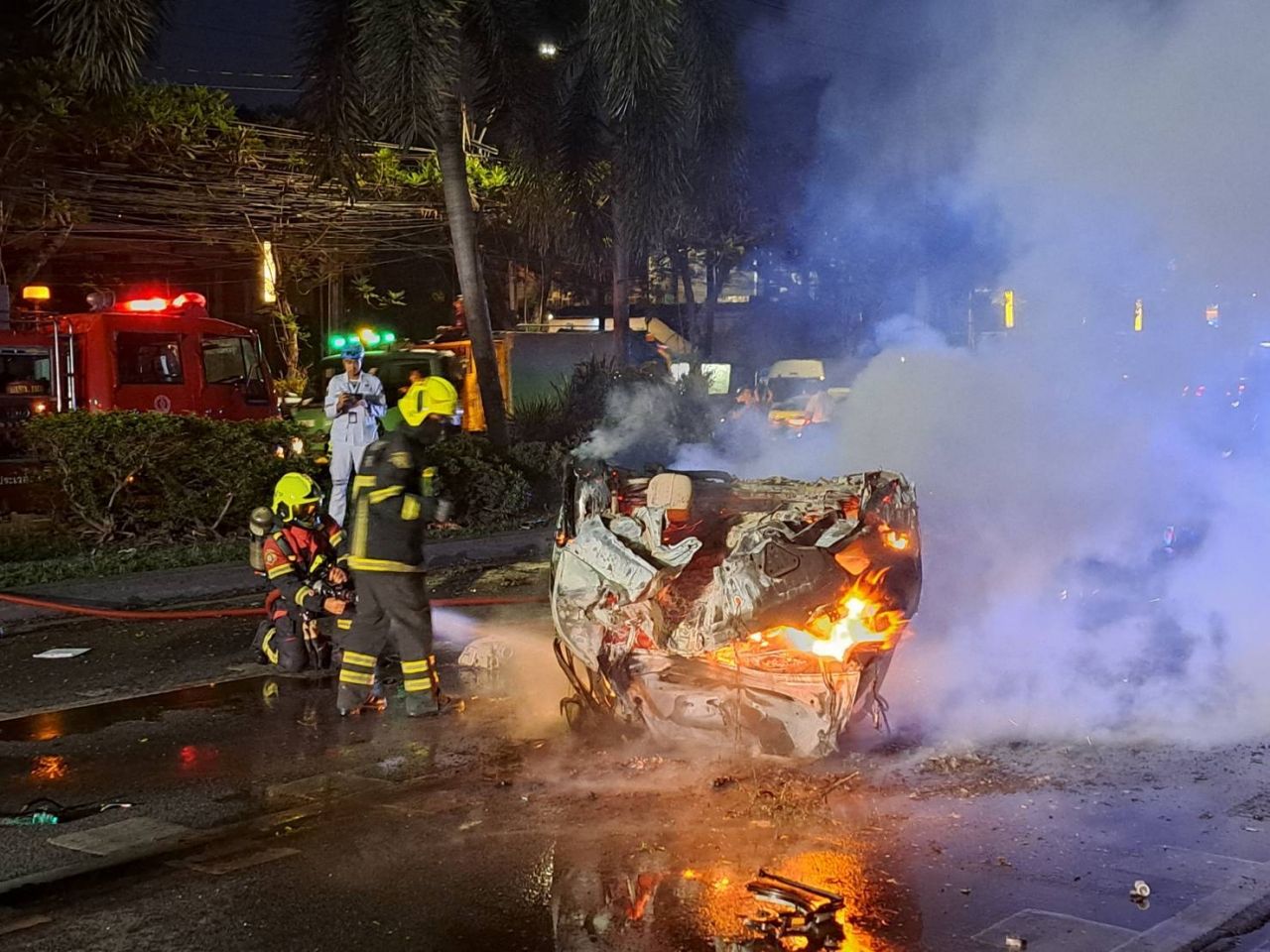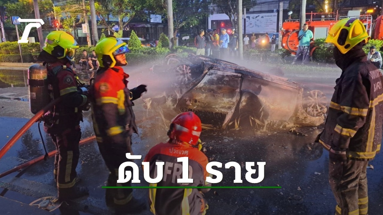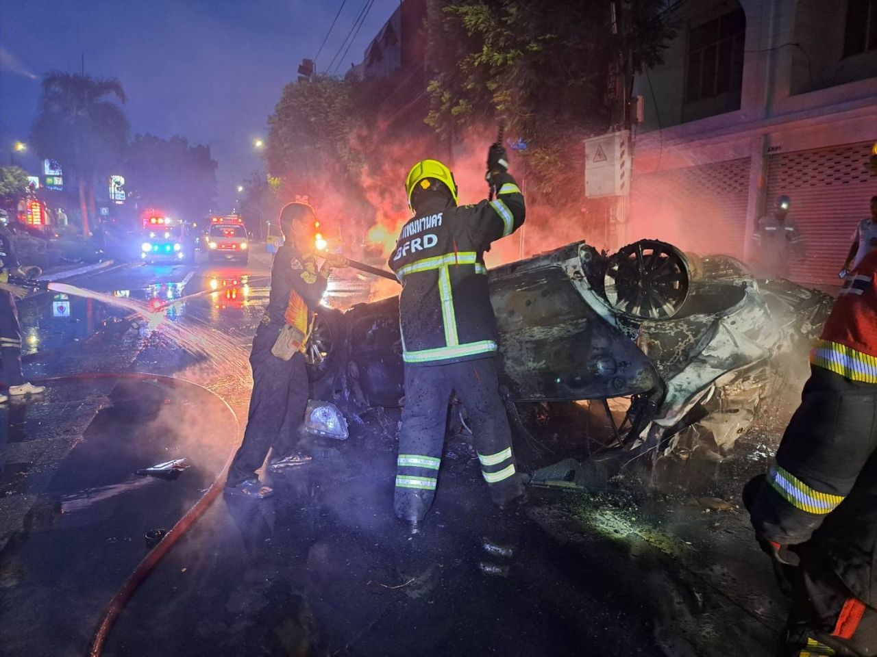 อุบัติเหตุรถเก๋งเสียหลักชนเกาะกลางพลิกคว่ำ เกิดไฟลุกท่วม คนขับ หมดสติติดอยู่ในรถถูกไฟคลอกร่างเสียชีวิตคาซากรถ เหตุเกิด บริเวณปากซอยพัฒนาการ 53/1