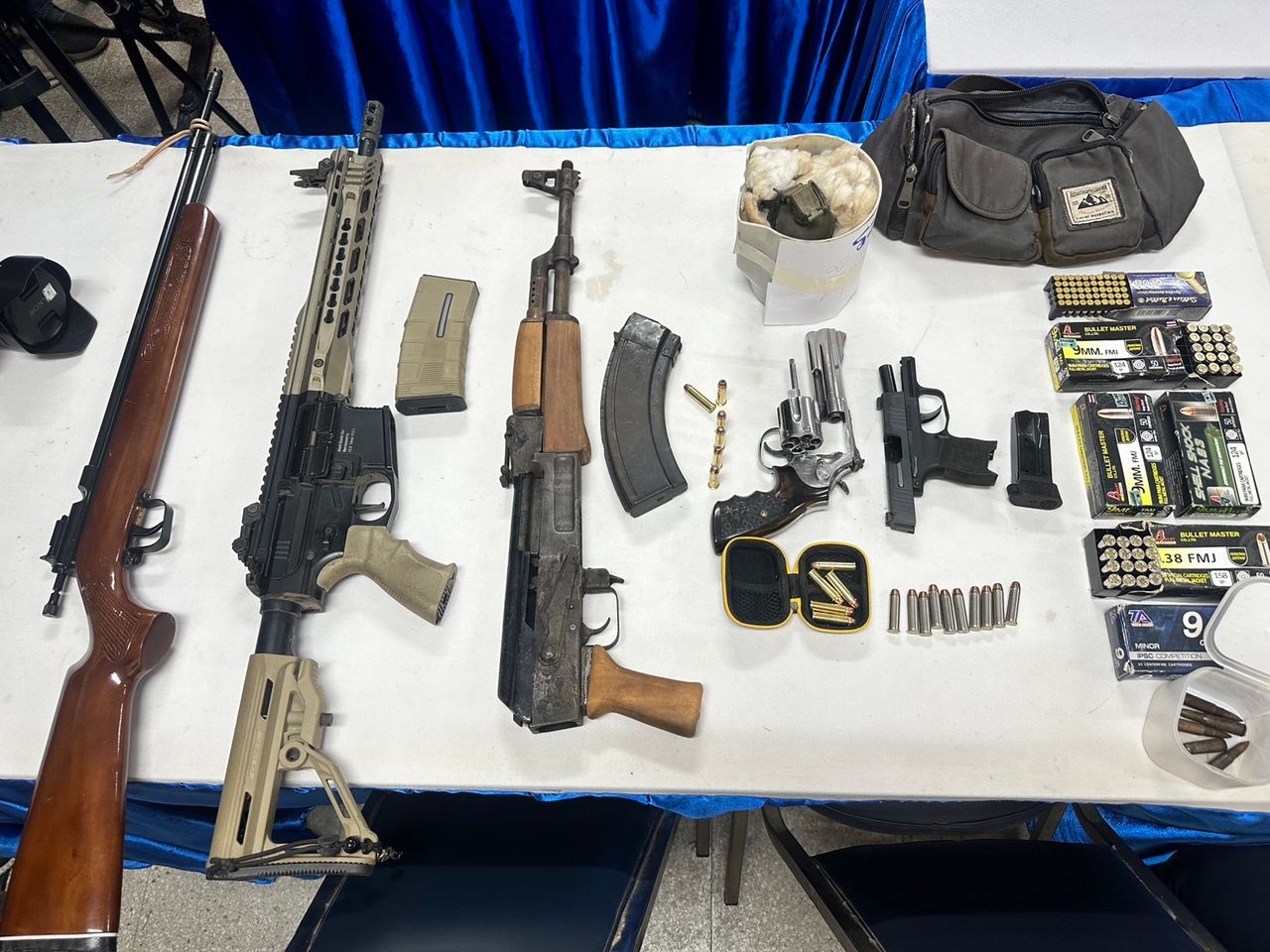 จากนั้นชุดจับกุมได้ตรวจสอบที่รถและบ้านพักของกลุ่มผู้ต้องหา พบของกลางจำนวน 18 รายการ อาทิ อาวุธปืน AK-43 (อาก้า) ไม่มีทะเบียน จำนวน 1 กระบอก, ปืนยาวอัดลม จำนวน 1 กระบอก, อาวุธปืนยาวขนาด .22 จำนวน 1 กระบอก, อาวุธปืนพกสั้น ขนาด .357 จำนวน 1 กระบอก, อาวุธปืนพกสั้นกึ่งอัตโนมัติ ขนาด 9 มม. จำนวน 1 กระบอก, เครื่องกระสุนปืนขนาดต่างๆ จำนวน 217 นัด, ระเบิดมือลูกเกลี้ยง M67 จำนวน 1 ลูก เป็นต้น