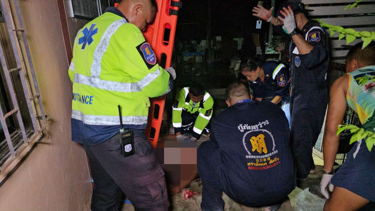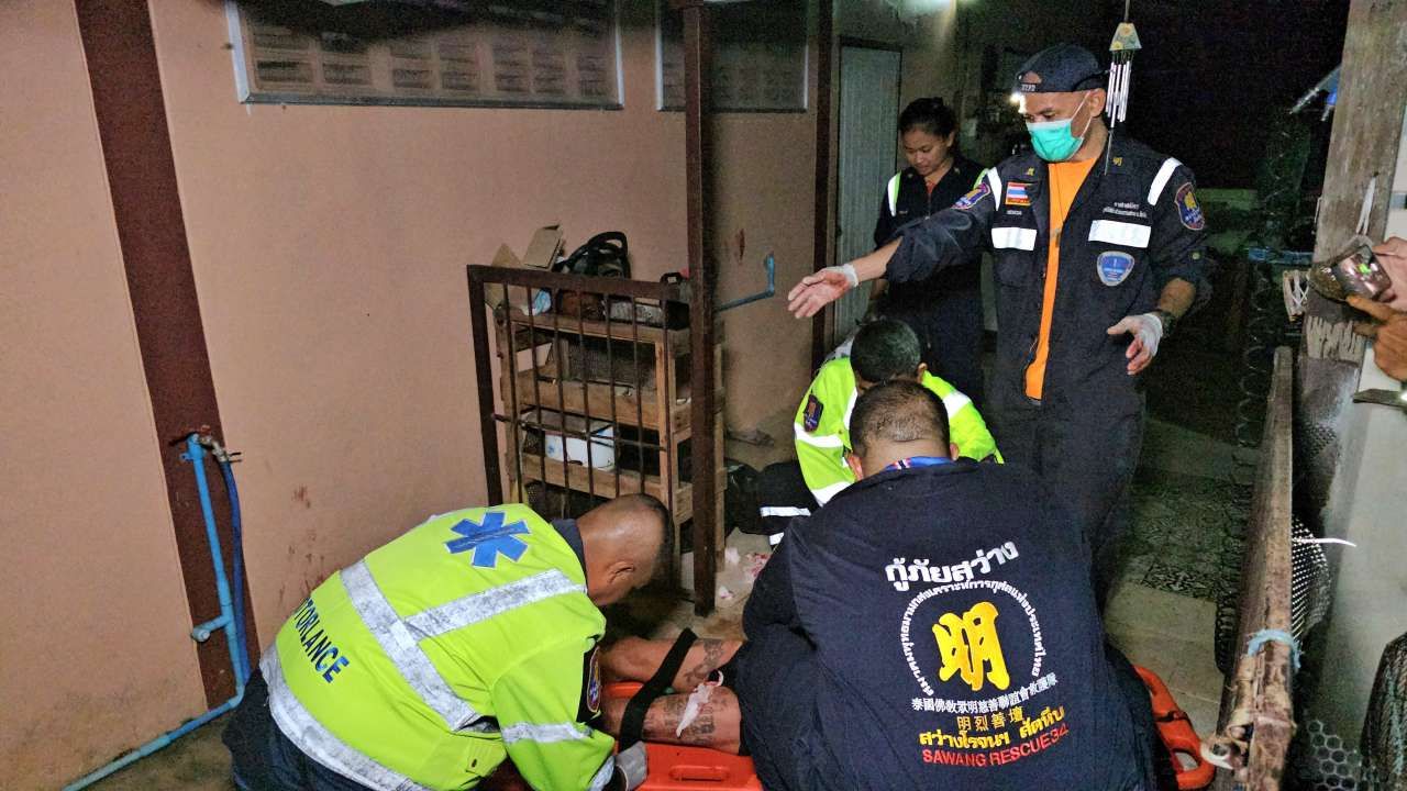 ที่เกิดเหตุข้างบ้านพบร่าง นายอำนาจ พิเนตร อายุ 54 ปี มีอาการเมาสุรา สภาพนอนจมกองเลือด บริเวณหน้าท้อง ลำตัว และหลัง ถูกอาวุธมีดปลายแหลมแทงรวม 11 แผล เบื้องต้น หน่วยกู้ภัยได้ช่วยกันปฐมพยาบาล ก่อนเร่งนำตัวส่งรักษาห้องฉุกเฉิน โรงพยาบาลสมเด็จพระนางเจ้าสิริกิติ์ กรมแพทย์ทหารเรือ