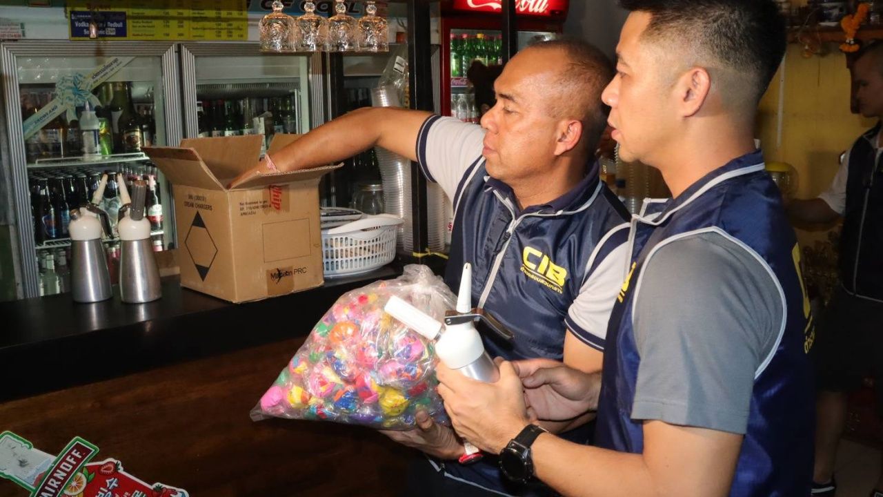จากการเข้าตรวจสอบ พบมีการลักลอบจำหน่ายลูกโป่งแก๊สหัวเราะจริง โดยสามารถตรวจยึดของกลาง แผ่นป้ายโฆษณาขายแก๊สหัวเราะ , ถุงบรรจุลูกโป่งจำนวนมาก หลอดบรรจุก๊าซไนตรัสออกไซด์, กระบอกสำหรับฉีดก๊าซไนตรัสออกไซด์, ลูกโป่ง ที่ยังไม่ได้ใช้เกือบ 3 พันชิ้น จึงตรวจยึดไว้เป็นหลักฐาน นอกจากนี้ยังควบคุมตัวแรงงานต่างด้าว ยืนรอขายลูกโป่งแก๊สหัวเราะตามหน้าร้านอาหารและสถานบันเทิงต่างๆ อีก 19 ราย ที่ยืนกระจายกันอยู่ ตรวจสอบไม่พบว่ามีใบอนุญาตว่าเข้ามาในราชอาณาจักรโดยถูกต้องตามกฎหมาย จึงได้จับกุมทั้งหมดส่ง กก.1.บก.ปคม. ส่วนแก๊สหัวเราะ นำส่ง กก.4.บก.ปคบ. ดำเนินคดีต่อไป