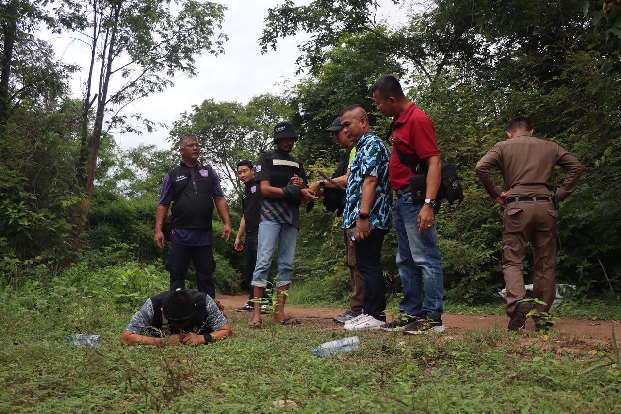 เมื่อเวลา 15.00 น. วันที่ 17 มิ.ย. 67 พ.ต.อ.เอนก จันทร์ศร รอง ผบก.ภ.จว.กำแพงเพชร, พ.ต.อ.นพพร โยธาราษฎร์ ผกก.สภ.พรานกระต่าย พร้อมด้วยเจ้าหน้าที่ตำรวจ สภ.พรานกระต่าย นำตัว นายเอกภาพ แสงโห้ หรือ ทับ อายุ 34 ปี อยู่บ้านเลขที่ 96 ม.2 ต.วังควง อ.พรานกระต่าย จ.กำแพงเพชร ไปทำแผนประกอบคำรับสารภาพหลังใช้อาวุธปืนไทยประดิษฐ์ 2 กระบอก จ่อยิง นายธงชัย อิ่มวงษ์ อายุ 31 ปี อยู่บ้านเลขที่ 27 หมู่ที่ 5 ต.วังควง อ.พรานกระต่าย จ.กำแพงเพชร นอนคว่ำหน้าเสียชีวิตอยู่บริเวณป่าละเมาะ หมู่ที่ 5 ต.วังควง อ.พรานกระต่าย จ.กำแพงเพชร ห่างจากบ้านผู้เสียชีวิตประมาณ 1 กิโลเมตร เหตุเกิดเมื่อวันที่ 13 มิ.ย.ที่ผ่านมา