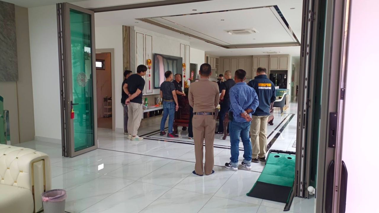 จากการตรวจสอบพบบ้านหลังดังกล่าว เป็นบ้านหรู 2 ชั้น ปลูกในเนื้อที่กว่า 2 งาน ภายในบ้านพบ 2 สามีภรรยาชาวจีน เจ้าของบ้าน ซึ่งประกอบธุรกิจอยู่ในพื้นที่เมืองพัทยา พบคนไทยอยู่ภายในบ้าน อีก 3 คน เป็นชาย 2 คน และหญิง 1 คน ที่โรงจอดรถพบรถหรู 2 คัน เป็นรถซุปเปอร์คาร์ 1 คัน ยี่ห้อเฟอร์รารี่ สีแดง ไม่ติดแผ่นป้าย และรถโรสซ์รอยส์ สีขาว ป้ายแดง ทะเบียน กทม. 1 คัน นอกจากนั้นยังพบสิงโตเพศอีก 2 ตัว ถูกเลี้ยงไว้อยู่ในกรงบริเวณข้างบ้าน