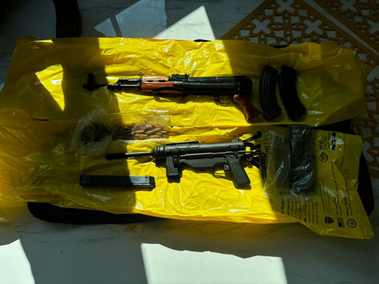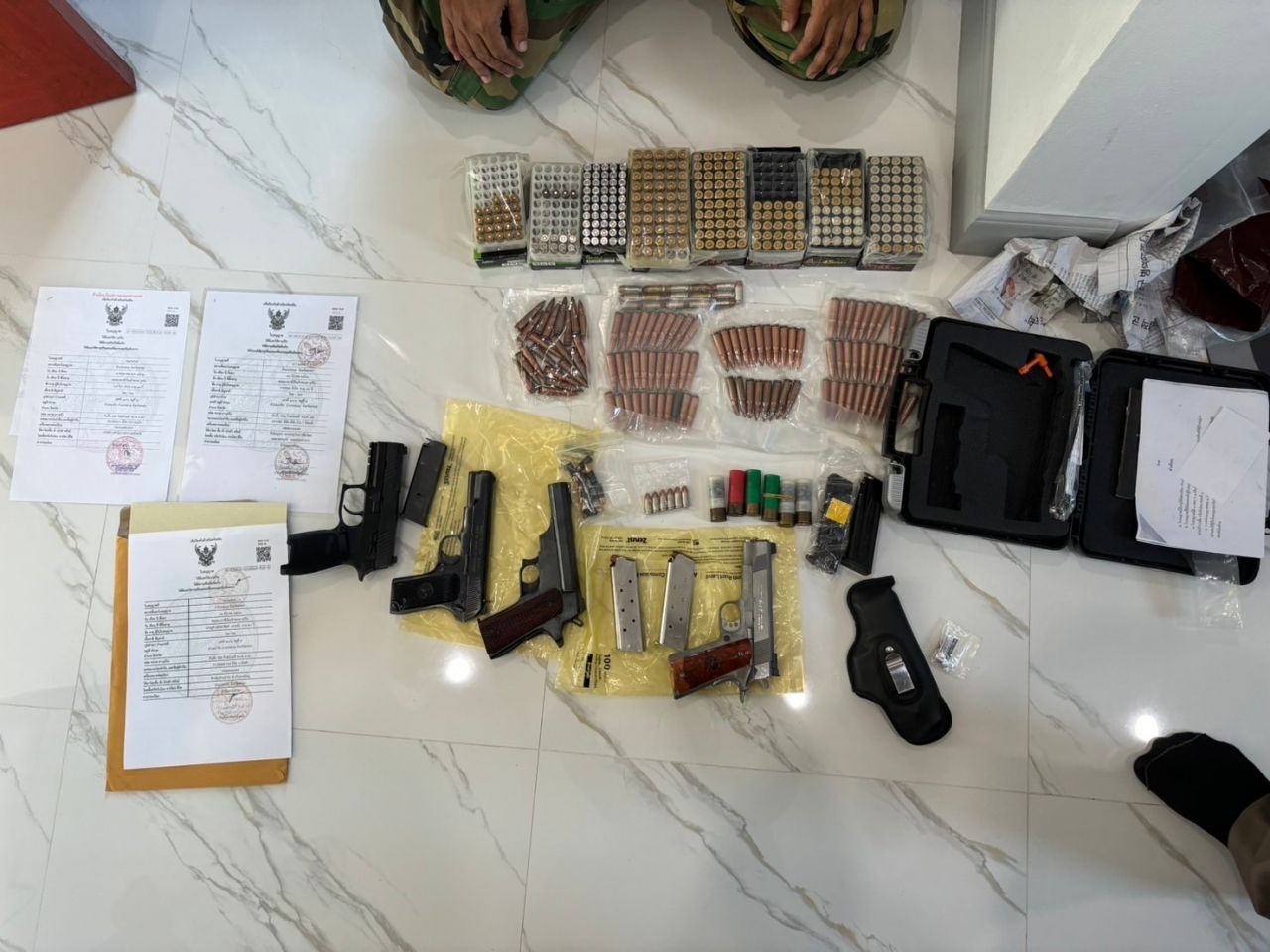 พร้อมของกลางอาวุธปืน AK-47 ไม่มีทะเบียน 1 กระบอก อาวุธปืนกลมือทอมป์สัน แบบ M3 ใช้กระสุน 11 มม. ไม่มีทะเบียน 1 กระบอก อาวุธปืนพกสั้นกึงอัตโนมัติ ขนาด 11 มม. มีร่องรอยลบเลขทะเบียน 1 กระบอก อาวุธปืนพกสั้นกึ่งอัตโนมัติ ขนาด 9 1 กระบอก อาวุธปืนพกสั้น ลูกซองหักลำไทยประดิษฐ์ ใช้กระสุน เบอร์ 12 ไม่มีทะเบียน 1 กระบอก กระสุนปืนขนาดต่างๆ รวม 500 นัด แม็กกาซีน 6 อันและใบ ป.4 ปลอม 2 ใบ