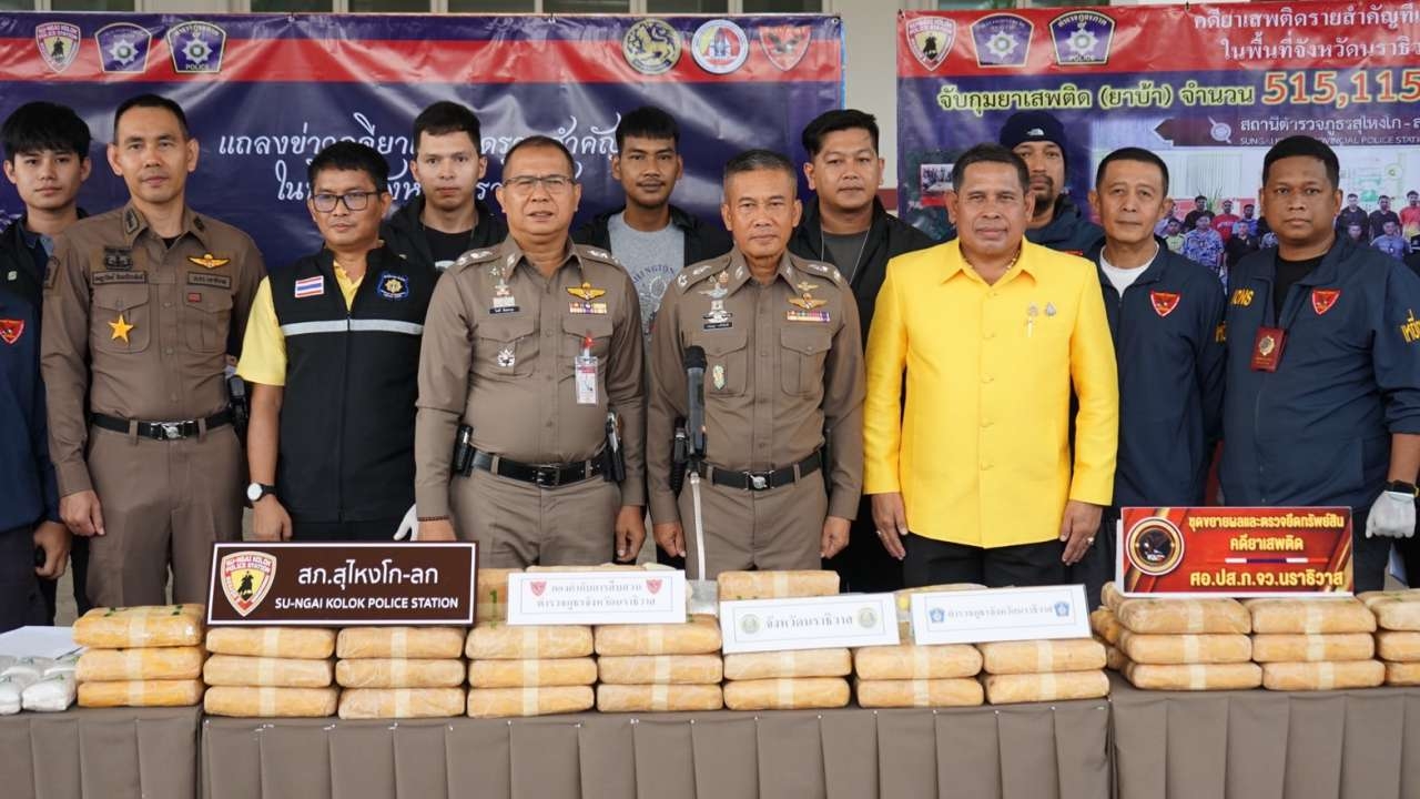 รอง ผบช.ภ.9 พร้อม ผู้การนราธิวาส ตั้งโต๊ะโชว์ผลงานจากการขยายผลตัดวงจรค้ายาเสพติด บุกจับยาบ้า 515,115 เม็ด พร้อมผู้ต้องหา 1 คน กลางเมืองสุไหงโก-ลก ชี้หากยาเสพติดดังกล่าวส่งออกไปยังประเทศที่ 3 จะมีมูลค่ากว่า 51 ล้านบาท