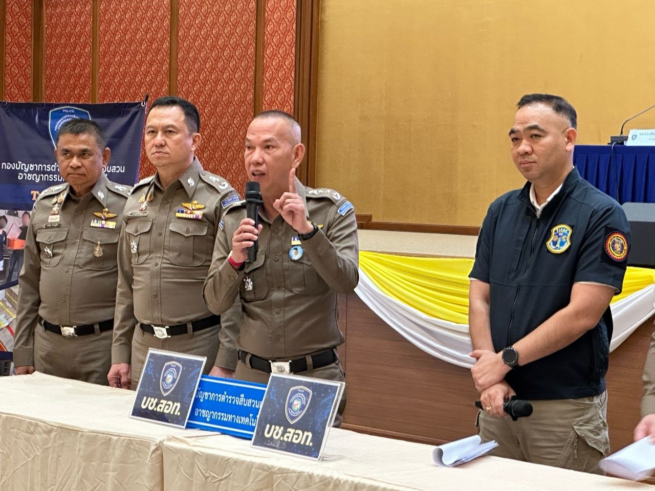 เมื่อเวลา 13.30 น. วันที่ 24 กรกฎาคม 2567 ที่กองบัญชาการตำรวจสืบสวนสอบสวนทางเทคโนโลยี (บช.สอท.) เมืองทองธานี อ.ปากเกร็ด จ.นนทบุรี พล.ต.ท.วรวัฒน์ วัฒน์นครบัญชา ผบช.สอท., พล.ต.ต.อรรถสิทธิ์ สุดสงวน รอง ผบช.สอท., พล.ต.ต.สถิตย์ พรมอุทัย ผบก.สอท.3 และ พล.ต.ต.ชูศักดิ์ ขนาดนิด ผบก.ตอท., Mr. Bryan Anderson รองผู้ช่วยทูตประจำภูมิภาค สำนักงานสืบสวนความมั่นคงแห่งมาตุภูมิ กระทรวงความมั่นคงแห่งมาตุภูมิสหรัฐอเมริกา (HSI) ร่วมแถลงผลปฏิบัติการ “INNOCENCE” บุกรวบหนุ่มใหญ่ใช้โปรไฟล์น้องหมีเนยหลอกเด็กหญิงวัย 12 ปี ถ่ายคลิปโป๊ พบมีเหยื่อที่โดนหลอกแล้วกว่า 5 ราย