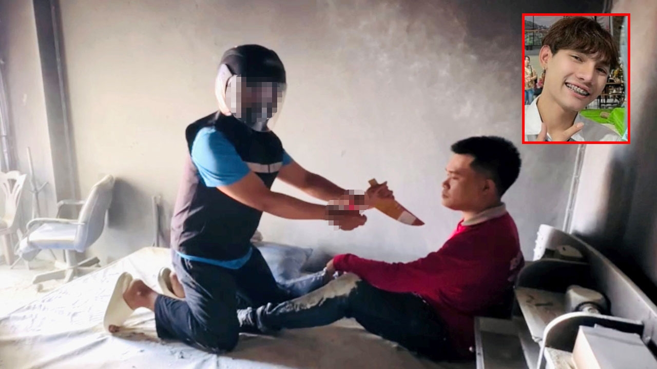 นายณัฐวุฒิ อ้นโต สาวสอง แสดงท่าใช้มีดแทงนายวิศว แต้มประสิทธิ์ (เล็กขวา) นักศึกษาก่อนจุดไฟเผาอำพรางขณะตำรวจพาไปทำแผนฯ ที่เกิดเหตุในหอพักซอยประชาชื่นนนทบุรี 8 แยก 1 ต.บางเขน อ.เมืองนนทบุรี.