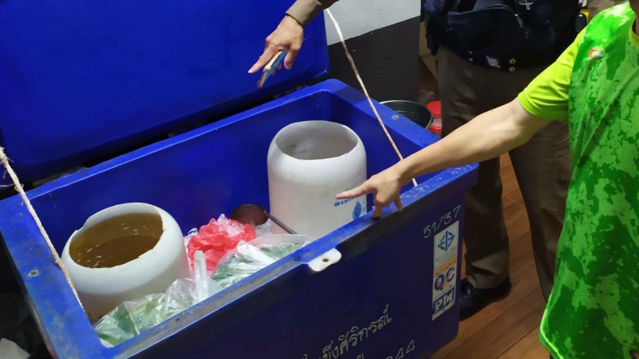 จับกุมตัวนายพลาธิป รัตนาชัย อายุ 18 ปี หมู่ 5 ต.แม่สลองนอก อ.แม่ฟ้าหลวง จ.เชียงราย ผู้ดูแลร้านขายน้ำกระท่อม พร้อมของกลาง 1. ใบพืชกระท่อมสดจำนวน 2 ห่อ น้ำหนัก 500 กรัม 2. กากใบพืชกระท่อมในถังพลาสติกสีขาว จำนวนครึ่งถัง 3. น้ำต้มพืชกระท่อมปรุงสำเร็จ จำนวน 2 ถุง 4. น้ำต้มพืชกระท่อมปรุงสำเร็จใส่แกลลอนพลาสติกสีขาว จำนวน 3 ลิตร 5. น้ำเชื่อมสำหรับปรุงแต่งสีและกลิ่น ยี่ห้อ Long Beach จำนวน 8 ขวด 6. คิวอาร์โค้ดสำหรับชำระเงิน ชื่อนายณรงค์พิสิทฐ์