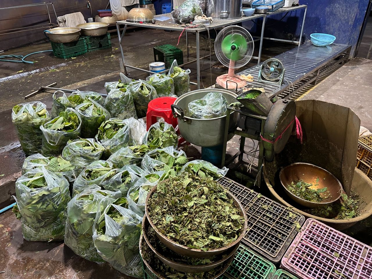 จุดเกิดเหตุเป็นโกดังขนาดใหญ่ประมาณ 2 ไร่ ซึ่งด้านนอกมีถังแช่น้ำกระท่อม น้ำตาลสดจำนวนมาก ที่รอส่งไปขายตามจุดต่างๆ ภายในโกดังพบคนงานแรงงานต่างด้าวเป็นกัมพูชา 10 คน เมียนมา 5 คน บางส่วนวิ่งหลบหนีขณะเข้าจับกุม ซึ่งพบหม้อต้ม ชุดเตาแก๊สจำนวน 43 ชุด ถังแก๊สจำนวนมาก ใบกระท่อมสด น้ำท่อมที่ถูกต้มและเตรียมบรรจุในขวดพลาสติก ขวดพลาสติก ฝาสีต่างๆ ไซรัป และสารกันบูดที่ใส่ลงไปขณะต้ม ซึ่งจะใส่ทุกหม้อต้ม โดยพบนายขวัญชัย พวงรัตน์ อายุ 38 ปี รับเป็นเจ้าของ โดยเปิดโกดังผลิตน้ำตาลสด น้ำลำไยเพื่อส่งขายบังหน้า แต่แอบผลิตน้ำกระท่อมไปด้วย