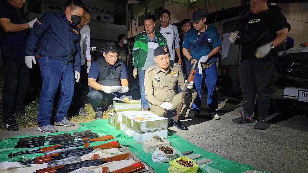 สอบสวนเบื้องต้นทราบชื่อ นายภัทรกร คุ้มแว่น อายุ 28 ปี ชาว จ.นนทบุรี คุมตัวผู้ต้องหาตรวจค้นภายในรถทั้ง 2 คัน พบของกลางเครื่องยิงลูกระเบิดแบบเอ็ม 79 (M79) 1 กระบอก ปืนอาก้า 6 กระบอก แมกกาซีน 17 อัน เครื่องกระสุนปืนขนาด 7.62 ประมาณ 8,000 นัด และเครื่องกระสุนปืนกลขนาดเอ็ม 60 (M60) ประมาณ 500 นัด แจ้งข้อหามีอาวุธปืนและเครื่องกระสุนปืน ที่นายทะเบียนไม่สามารถออกใบอนุญาตให้ได้ไว้ในความครอบครองโดยผิดกฎหมาย ผู้ต้องหารับว่า กำลังขับรถขนอาวุธสงครามทั้งหมดไปส่งให้ลูกค้าตามการสั่งซื้อ