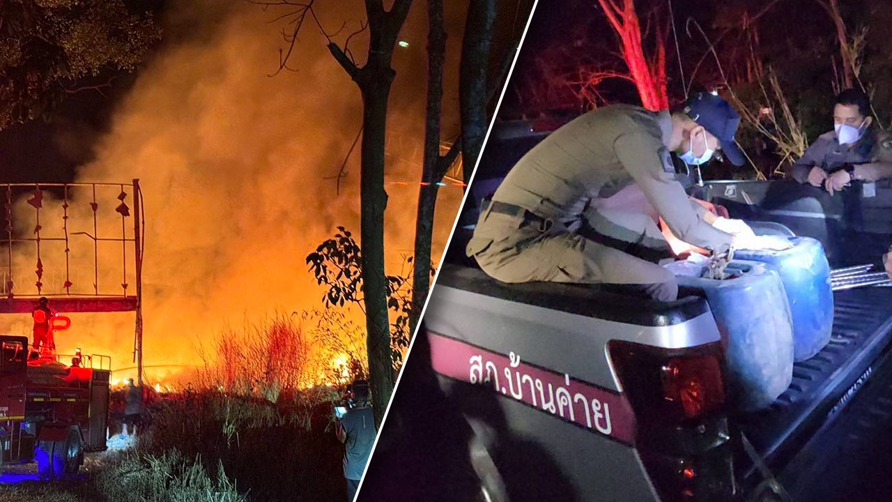 ที่เกิดเหตุพบต้นเพลิงลุกไหม้เป็นบริเวณกว้างรัศมีประมาณ 10 เมตร อยู่บริเวณโกดังที่ 5 ติดกับสวนยางพาราของชาวบ้าน เจ้าหน้าที่ดับเพลิงจึงฉีดน้ำสกัดใช้เวลา 1 ชม. จึงควบคุมเพลิงไว้ได้ เข้าตรวจสอบที่เกิดเหตุพบจุดที่เกิดเพลิงไหม้ เป็นกองเศษวัสดุ ทั้งถุงยางอนามัย เข็มฉีดยา ถุงพลาสติก และเศษกระดาษ พร้อมตรวจสอบใกล้จุดเกิดเหตุบริเวณสวนยางพาราที่อยู่ติดกับโกดัง 5 พบถังน้ำมันสีน้ำเงิน ขนาด 30 ลิตร จำนวน 2 ถัง ตั้งห่างกันราว 2 ม. โดยไม่พบฝาปิดถังทั้ง 2 ถัง ถังแรกพบว่าน้ำมันในถังมีกลิ่นคล้ายน้ำมันดีเซล ถูกเทจนเกือบหมด เหลือติดก้นถังเล็กน้อย อีกถังพบน้ำมันยังเต็มถัง เจ้าหน้าที่พิสูจน์หลักฐานจึงเก็บกลับไปเก็บไว้ยัง สภ.บ้านค่าย เพื่อให้เจ้าหน้าที่ที่เชี่ยวชาญมาตรวจสอบว่า ของเหลวในถังเป็นสารชนิดใด และทำไมถึงถูกนำมาทิ้งไว้ข้างโรงงานดังกล่าว เป็นการจงใจวางเพลิงหรือไม่ และตรวจสอบลายนิ้วมือแฝงบนถังน้ำมัน