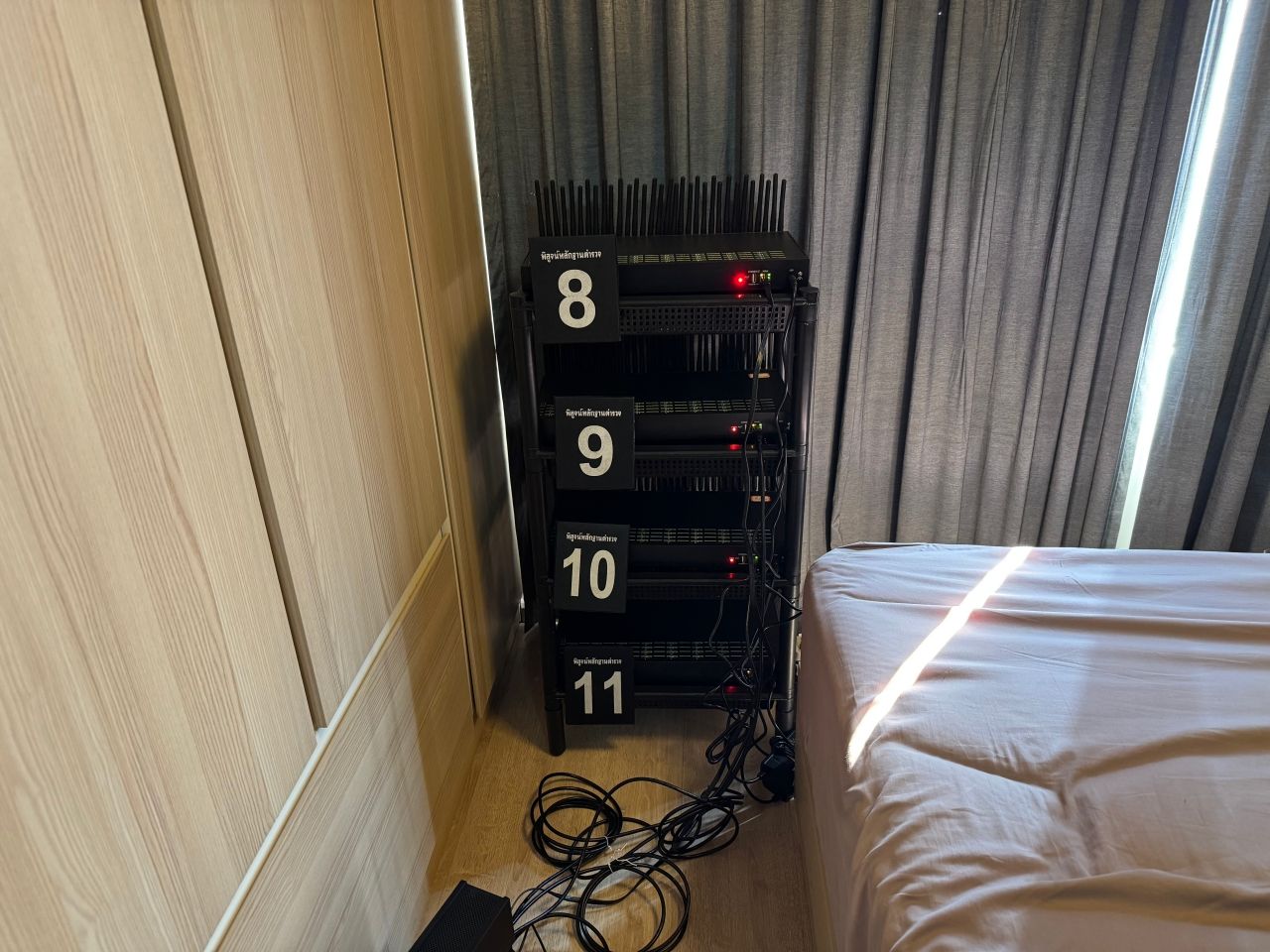 จากการผลตรวจค้นห้องพักพบของกลางหลายรายการ ทั้งเครื่องแปลงสัญญาณโทรศัพท์ ซิมบ็อกซ์ จำนวน 4 เครื่อง 1 เครื่องสามารถใส่ได้ 32 ซิม และใน 1 เครื่องสามารถโทรออกได้ 6,000 - 8,000 ครั้งต่อวัน ซึ่งแสดงว่า 4 เครื่อง 128 ซิม สามารถโทรออกได้มากกว่า 800,000 ครั้งต่อวัน นอกจากนี้ยังมีโมเด็มต่อสัญญาณอินเทอร์เน็ต จำนวน 2 เครื่อง กล้องวงจรปิด จำนวน 1 ตัว กระเป๋าเดินทางใบใหญ่ 1 ใบ จึงได้ตรวจยึดไว้ของกลางทั้งหมด พร้อมให้ตำรวจพิสูจน์หลักฐาน ตรวจเก็บ ดีเอ็นเอ และลายนิ้วมือแฝง นำส่งพนักงานสอบสวน สน.พระโขนง