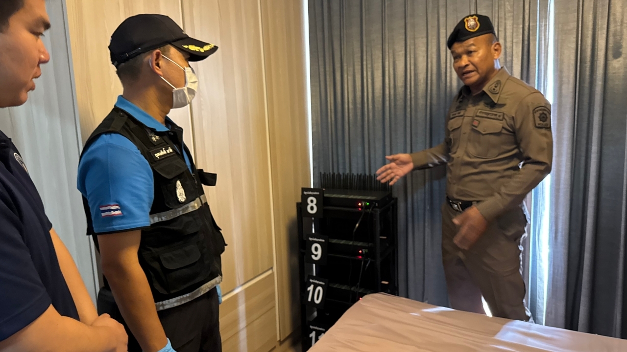 ตำรวจภาค 1 สนธิกำลังสกัดแก๊งคอลเซ็นเตอร์ ตรวจยึดซิมบ็อกซ์ 4 เครื่องซุกอยู่ในคอนโดย่านสุขุมวิท 64 หลังแกะรอยคดีหลอกโอนเงินที่น่าน สมุทรปราการ และจังหวัดทางภาคใต้ พร้อมคุมตัวชาวเมียนมา 2 คน สอบปากคำเพิ่มเติม หลังอ้างไม่รู้ใครนำซิมบ็อกซ์มาติดตั้ง