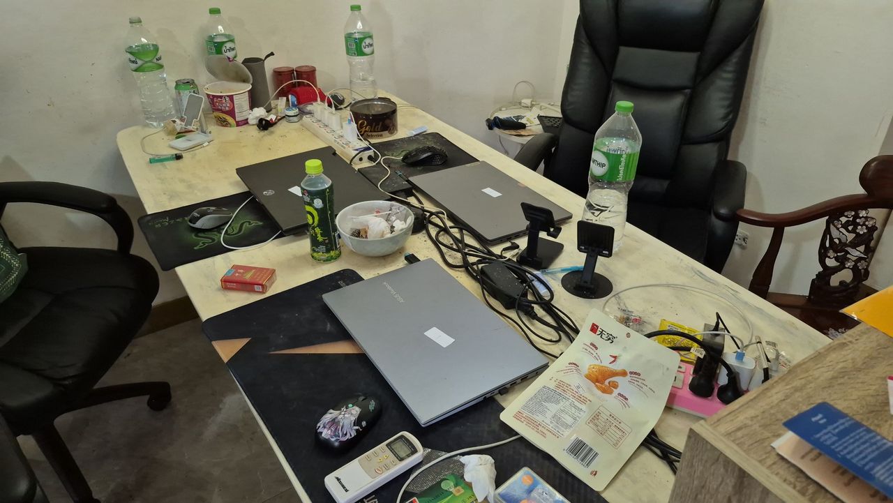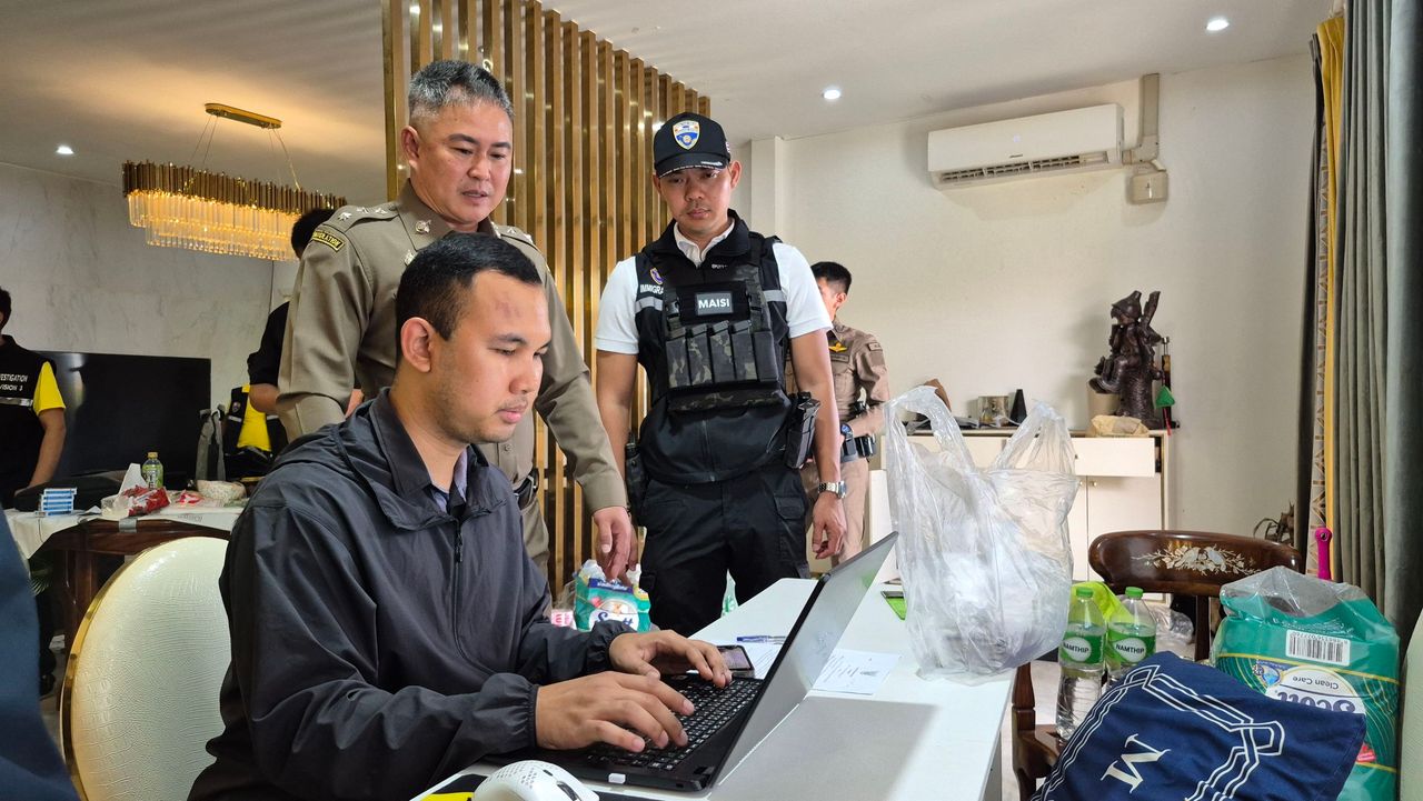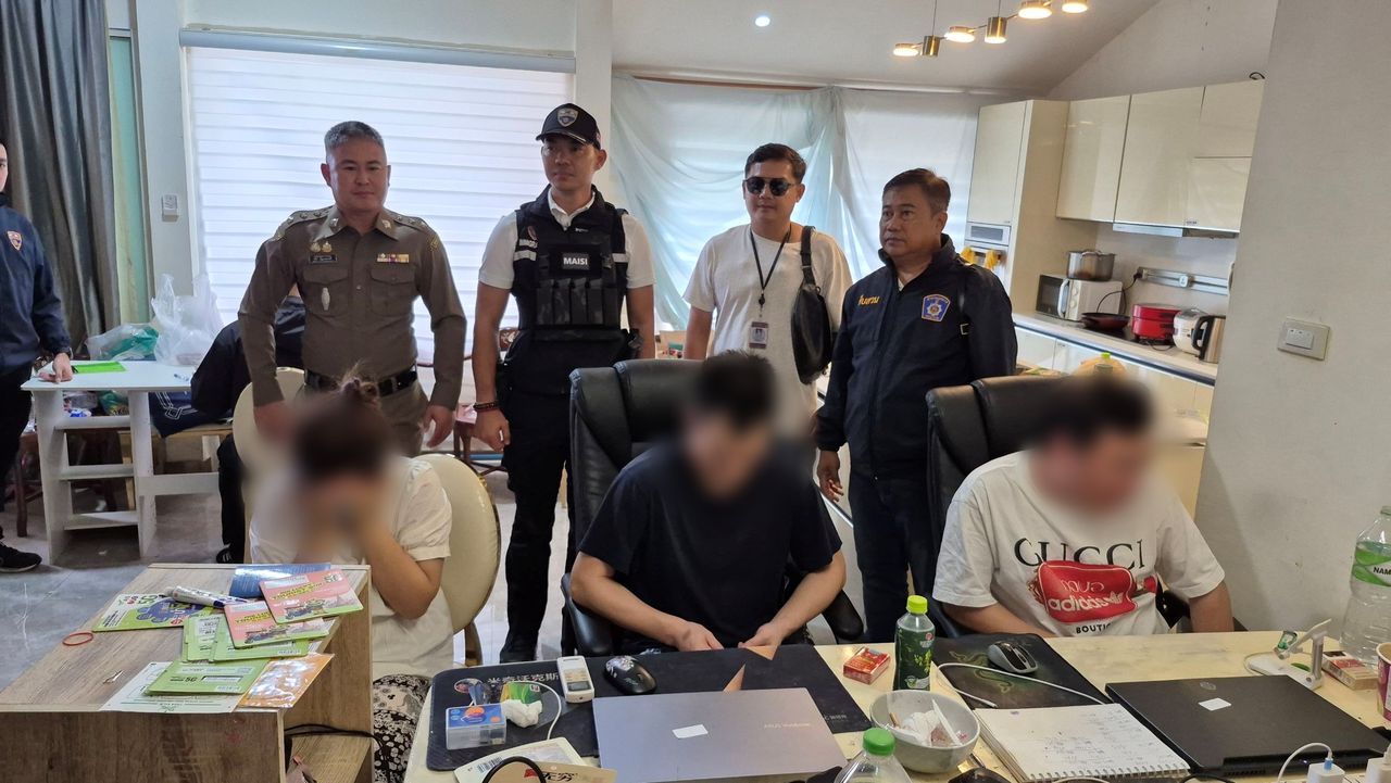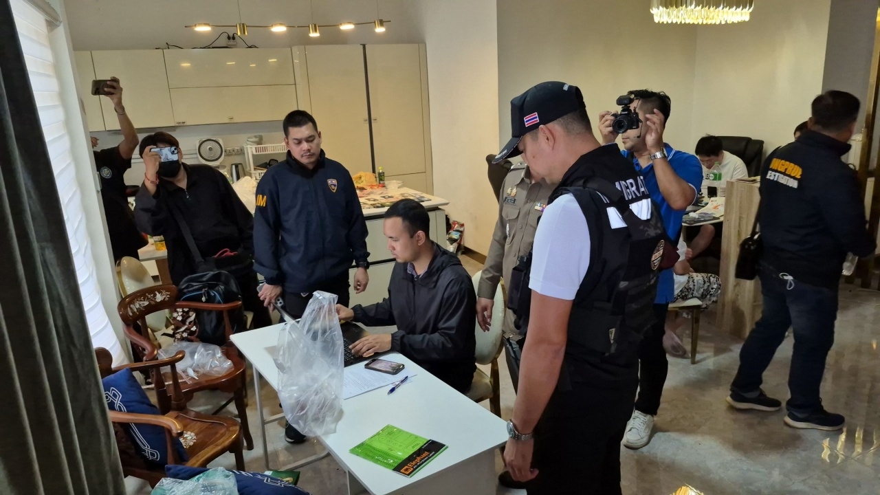 จากการเข้าปิดล้อมบ้านหลังดังกล่าว เป็นบ้านหรูมีเนื้อที่ 150 ตารางวา และมีรั้วล้อมรอบขอบชิด ซึ่งจากการเข้าตรวจสอบในเบื้องต้น พบกลุ่มชาวจีนทั้งชายและหญิง กำลังนั่งอยู่หน้าคอมพิวเตอร์โน้ตบุ๊ก และมีโทรศัพท์มือถือวางเรียงรายไม่ต่ำกว่า 20 เครื่อง ตำรวจจึงแสดงหมายค้นและเข้าทำการตรวจสอบอย่างละเอียด โดยสามารถตรวจยึดคอมพิวเตอร์โน้ตบุ๊กได้จำนวน 3 เครื่อง และโทรศัพท์มือถือ 29 เครื่อง และทำการสอบปากคำกลุ่มชาวจีนซึ่งนั่งอยู่ภายในบ้าน เป็นผู้หญิง 1 คน (ถือวีซ่านักท่องเที่ยว) และผู้ชาย 4 คน (ถือวีซ่านักเรียน)